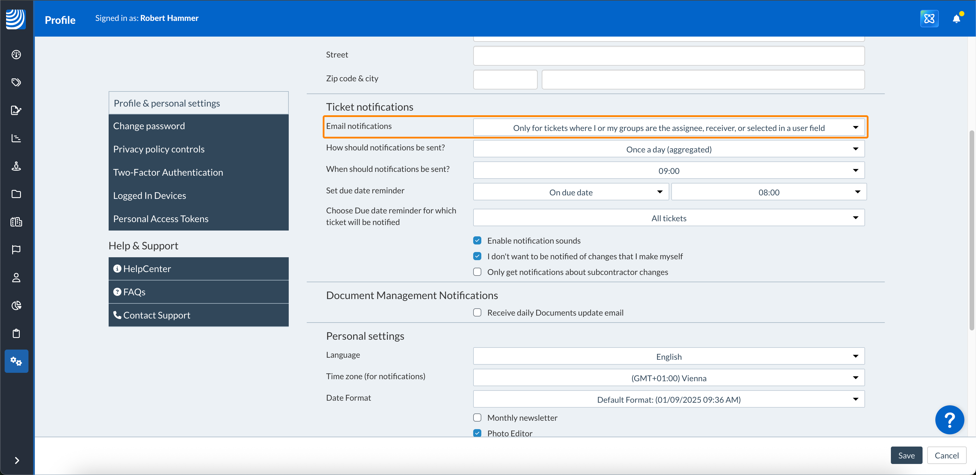 Vous pouvez configurer des notifications pour les mises à jour de tickets et les rappels de dates d'échéance.