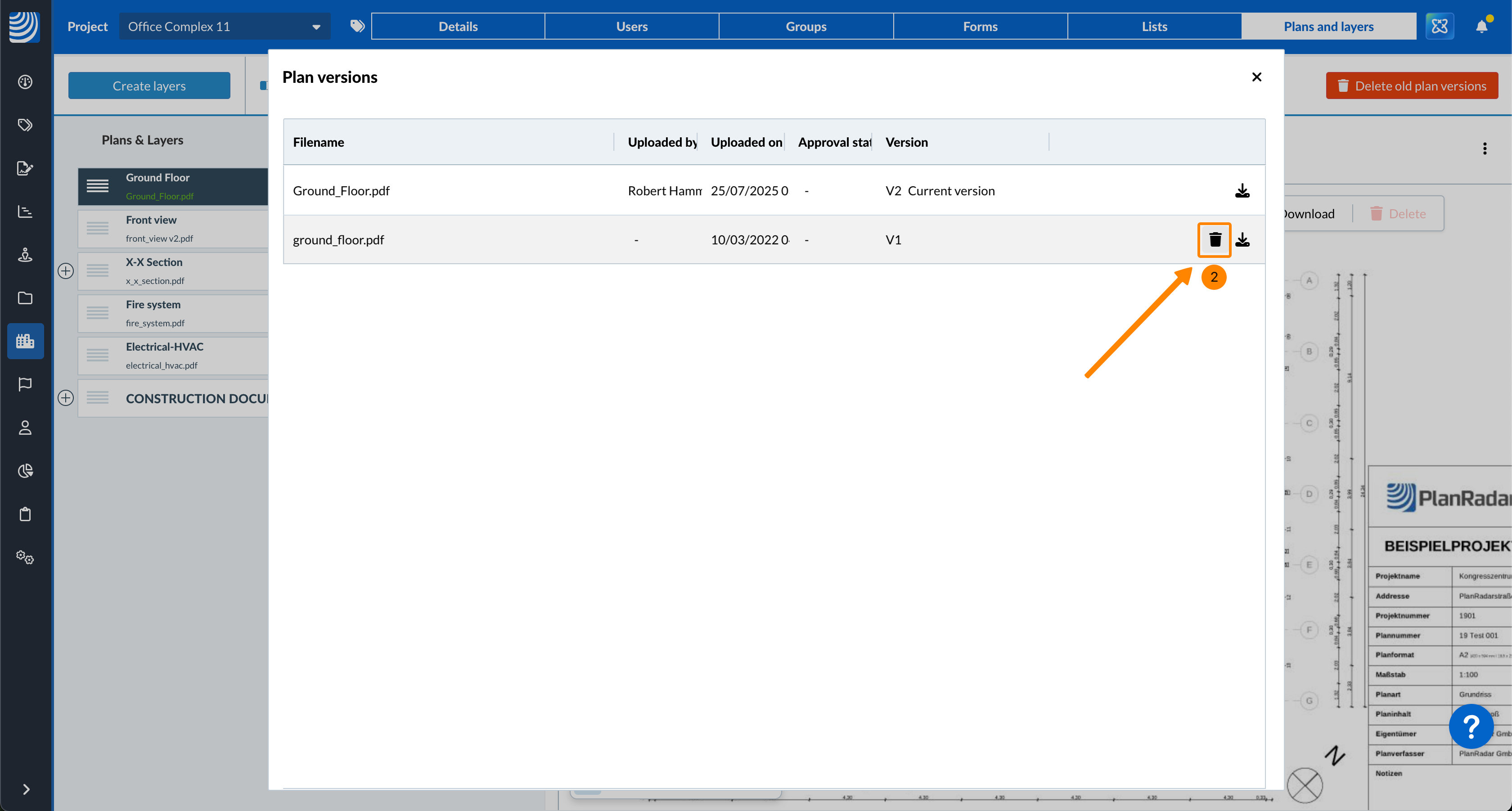 Le nombre figurant dans le bouton indique le nombre de versions du plan. - Cliquez sur l'icône Delete à côté de la version du plan que vous souhaitez supprimer