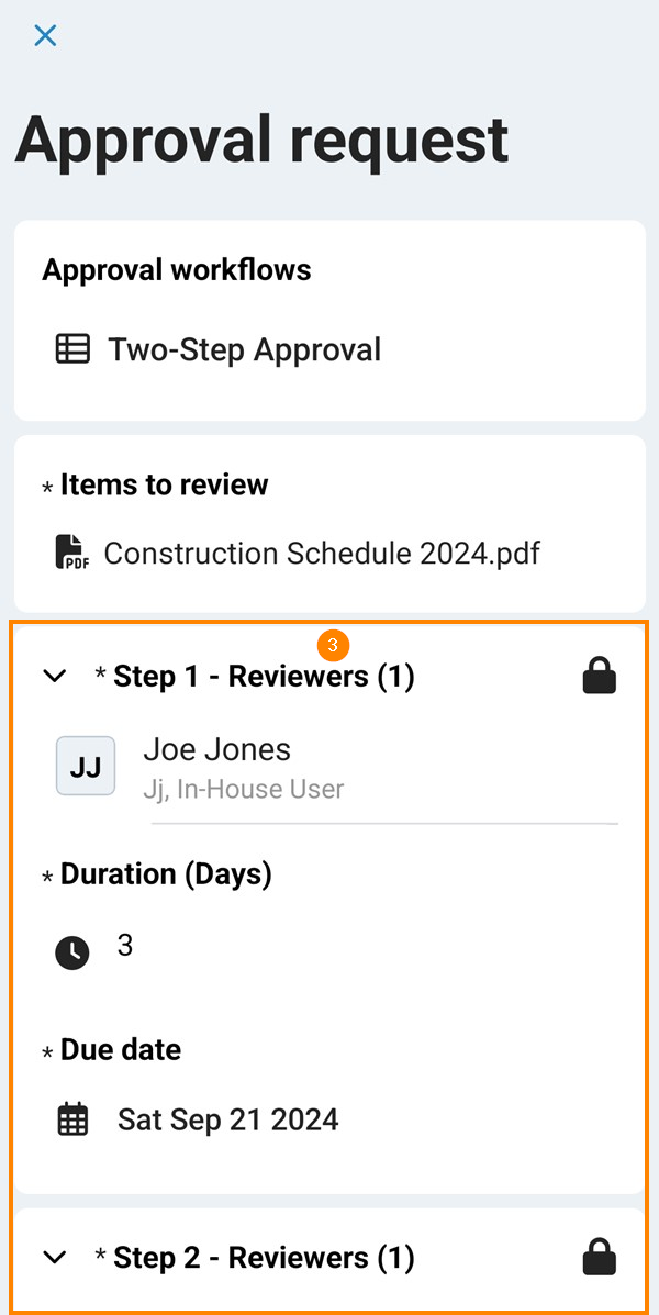 Ajoutez un ou plusieurs réviseurs à chaque étape et définissez la durée ou la date d'échéance de chaque étape, comme décrit ci-dessus dans Remplir et envoyer une demande d'approbation et répétez l'opération pour ajouter d'autres étapes.