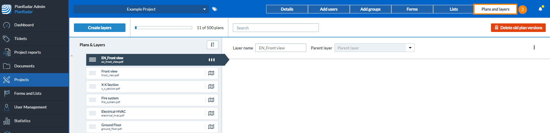 Vous pouvez mettre à jour un plan existant avec une nouvelle version. Tout d'abord, accédez à Plans et couches de votre projet.