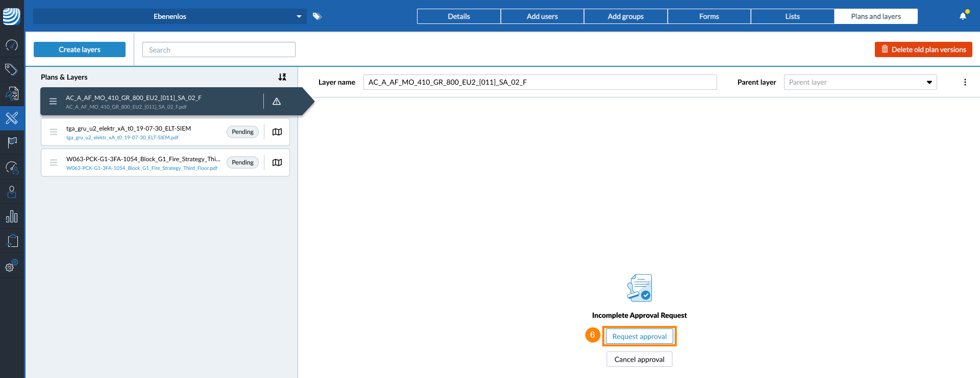 PlanRadar permet de demander des approbations sur les nouvelles versions de plans téléchargées dans un projet, de la même manière que approvations de documents. Les demandes d'approbation pour les versions de plan sont créées dans Projet > Plans et couches.