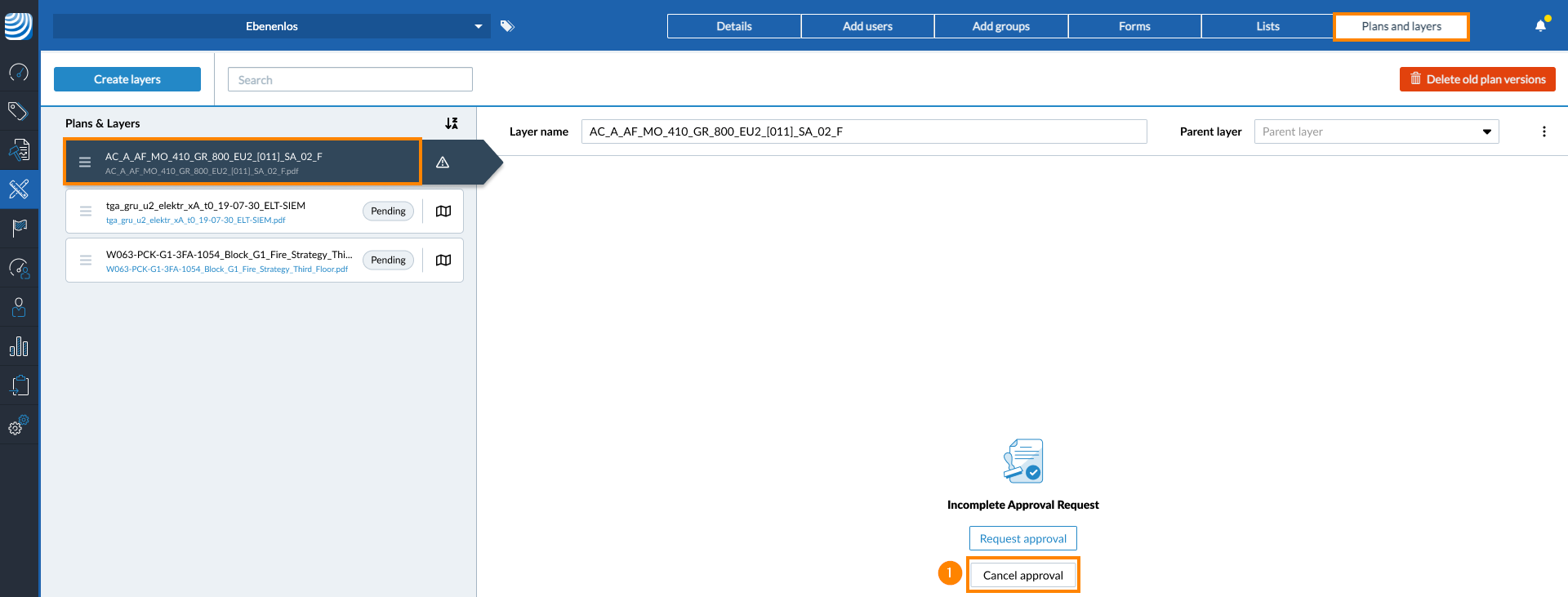 Si vous avez téléchargé un plan avec la case Request approval cochée, une fois le plan traité, vous pouvez choisir d'annuler la demande d'approbation. Vous avez le choix entre