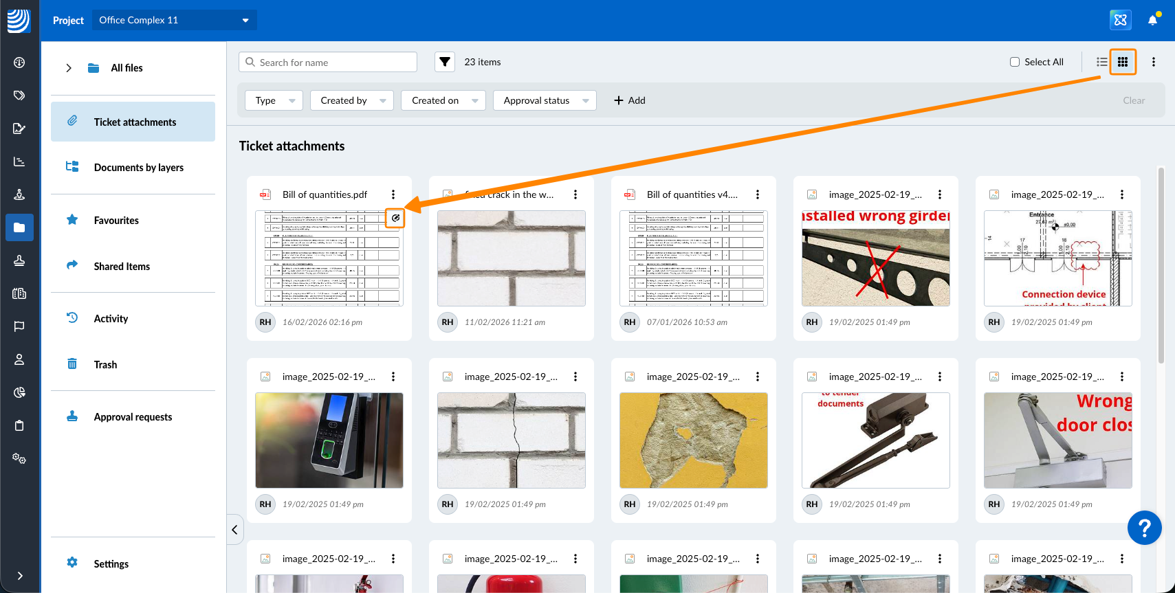 - Par l'icône sur la vignette dans la grille d'affichage des pièces jointes