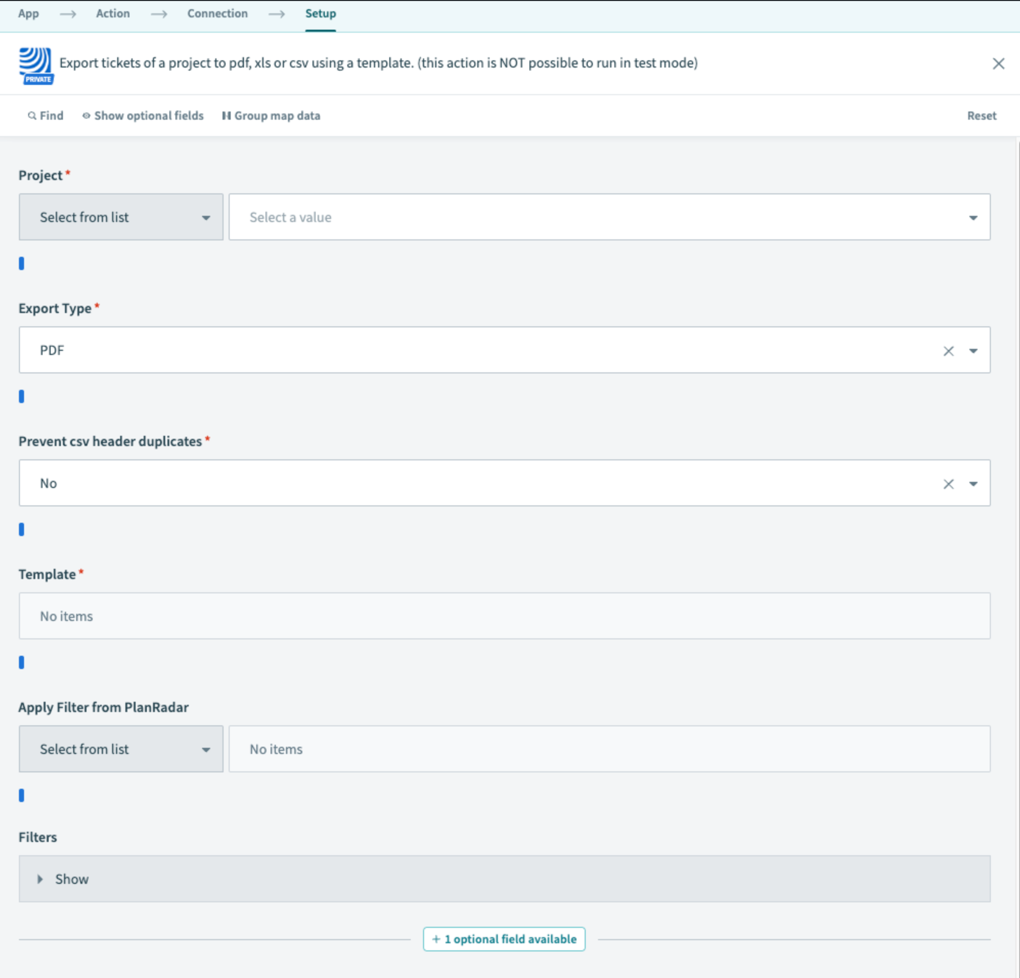 Un modèle de rapport doit être défini dans PlanRadar