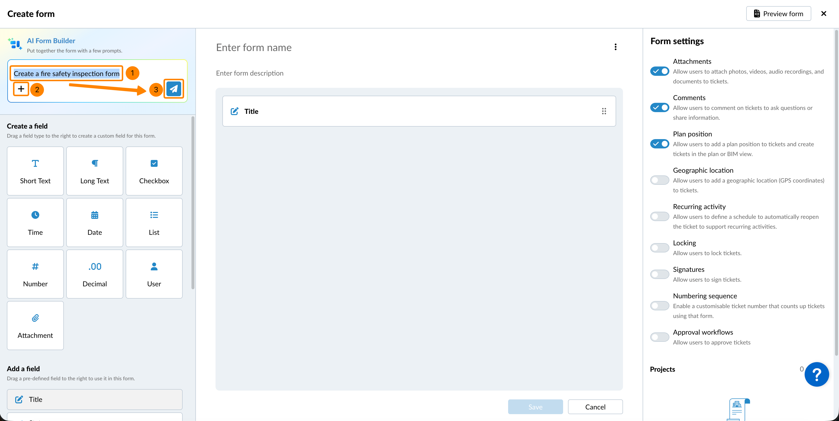 L'AI Form Builder crée et configure des formulaires à partir d'une description en langage naturel ou d'un document téléchargé, qu'il s'agisse de créer un nouveau formulaire ou de modifier un formulaire existant.