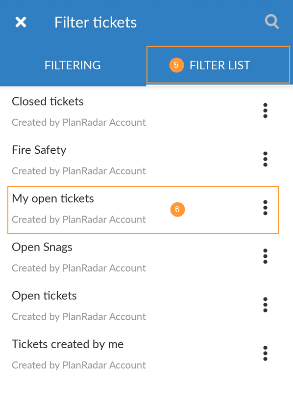 Filtriranje ticketa funkcionira slično kao pretraživanje. Filteri su dostupni u prikazu popisa i prikazu nacrta.