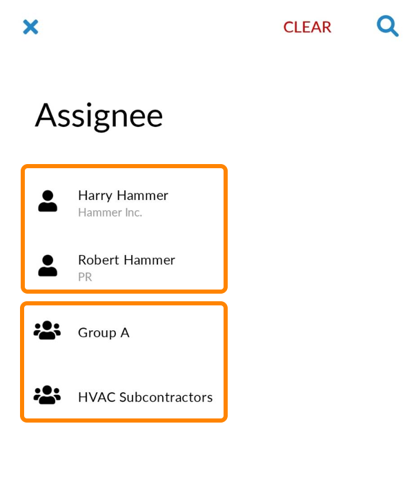 Ako vaš projekt sadrži grupe, izbornici 'dodijeljeni' i 'primatelj' prvo će navesti korisnike, a zatim grupe: