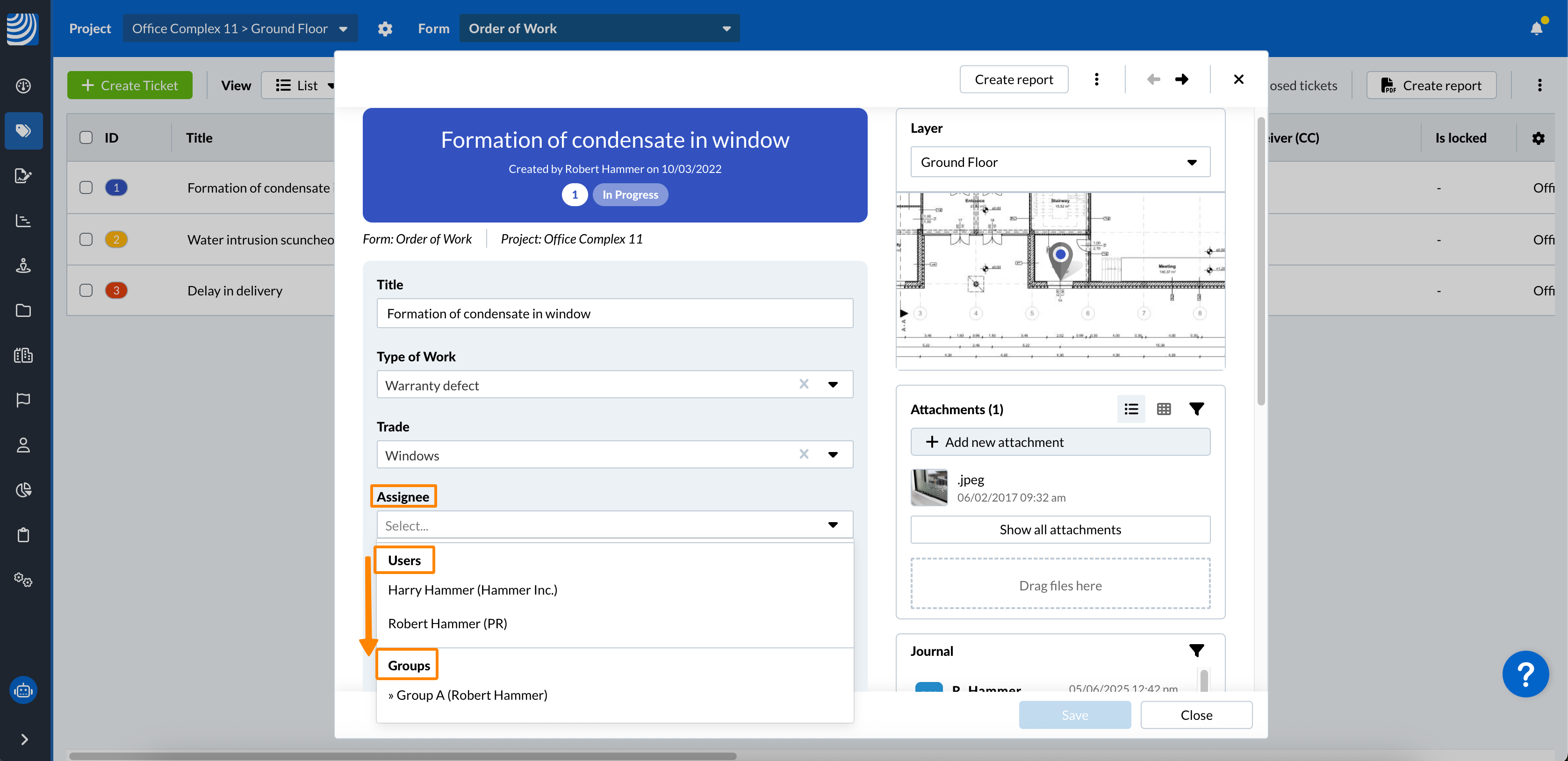 Ako vaš projekt sadrži grupe, padajući izbornici 'dodijeljeno lice' i 'primatelj' prvo će navesti korisnike, a zatim grupe: