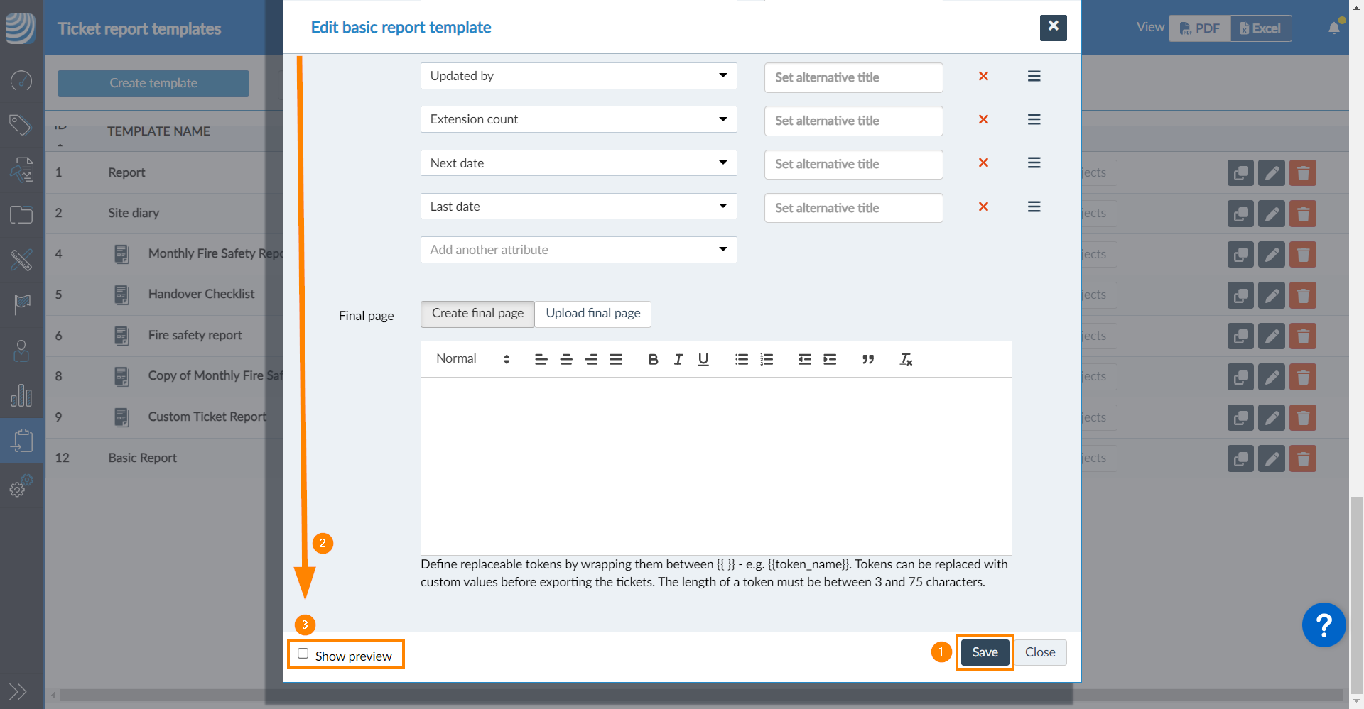Uređivač teksta za osnovne predloške izvješća o ulaznicama uključuje samo 4 veličine teksta, poravnanje teksta, podebljano, kurzivno i podcrtano, uređeni i neuređeni popis i stil napomena. Postoji više opcija za oblikovanje teksta u naprednim predlošcima izvješća o ulaznicama.