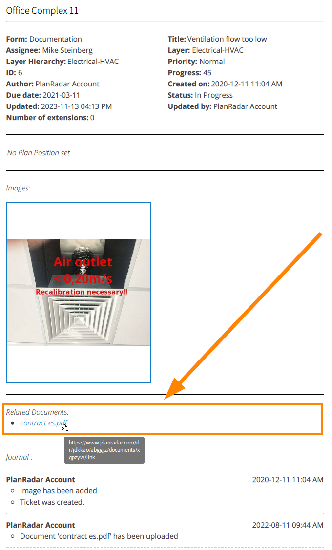 Ako su uključeni dokumenti ulaznica, njihovi su naslovi uvijek navedeni u odjeljku Povezani dokumenti s vezama na stvarni dokument u PlanRadaru. Postavljeni su iza slika i prije dnevnika svake karte.
