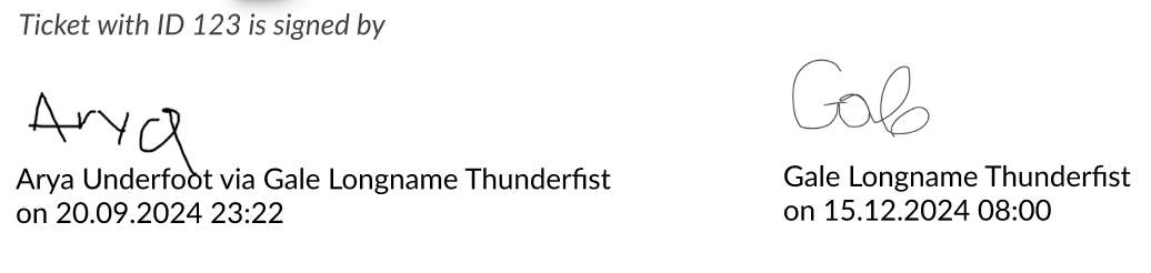 Ako je omogućeno, svi potpisi (uključujući ime i vremensku oznaku) bit će prikazani na kraju svake odgovarajuće karte. Pročitajte više u Potpis na ulaznicu.