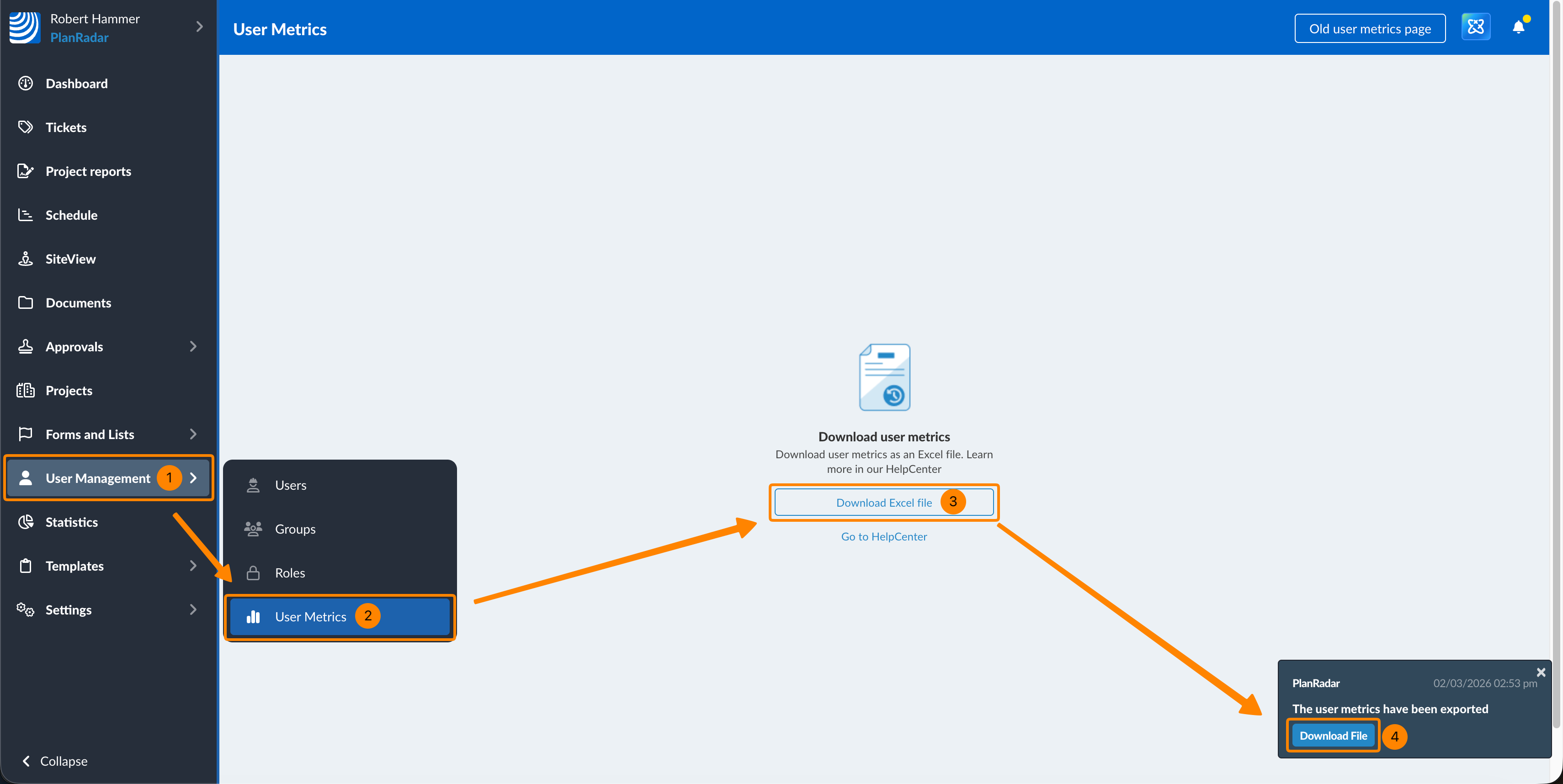 Stranica Stare korisničke metrike i dalje je dostupna ako je vaš PlanRadar račun kreiran prije 5. ožujka 2026. Ta će stranica biti uklonjena 5. rujna 2026. I dalje ćete moći preuzeti korisničke metrike pomoću nove stranice Korisničke metrike. Pročitajte više u nastavku u Kako pristupiti starim korisničkim metrikama.
