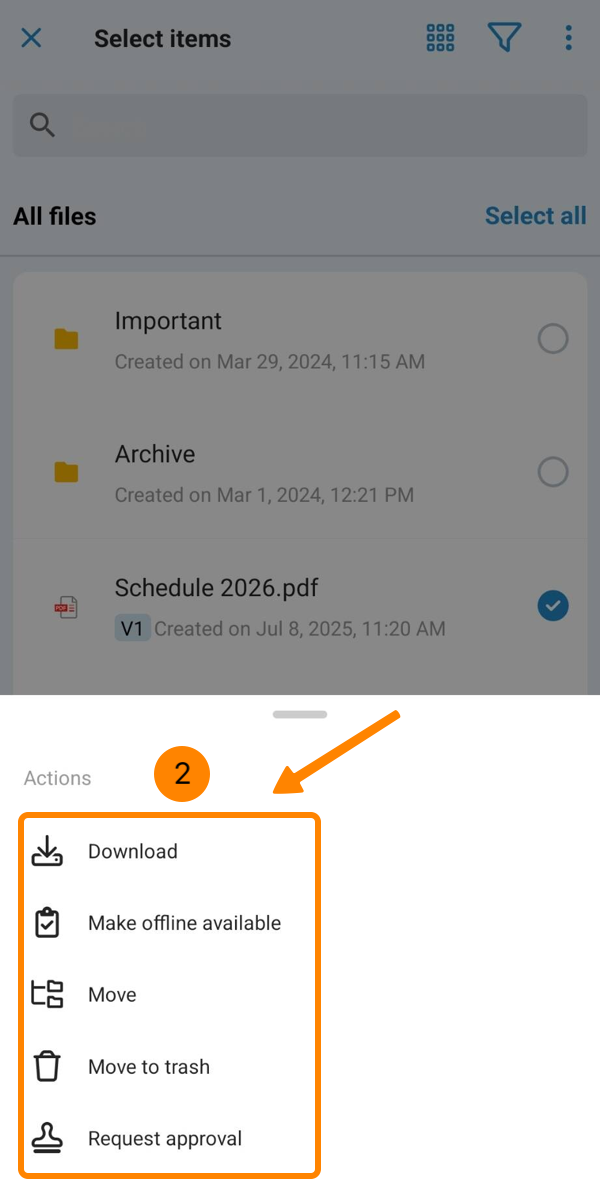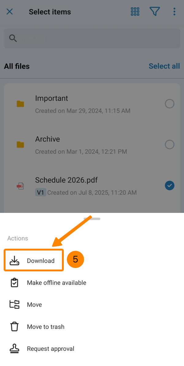 Skupne radnje uključuju Preuzimanje, Zahtjev za odobrenje, Premještanje i Premještanje u smeće te postaju dostupne ako je odabrana jedna ili više stavki. Također možete Učiniti datoteke dostupnima izvan mreže u mobilnoj aplikaciji.