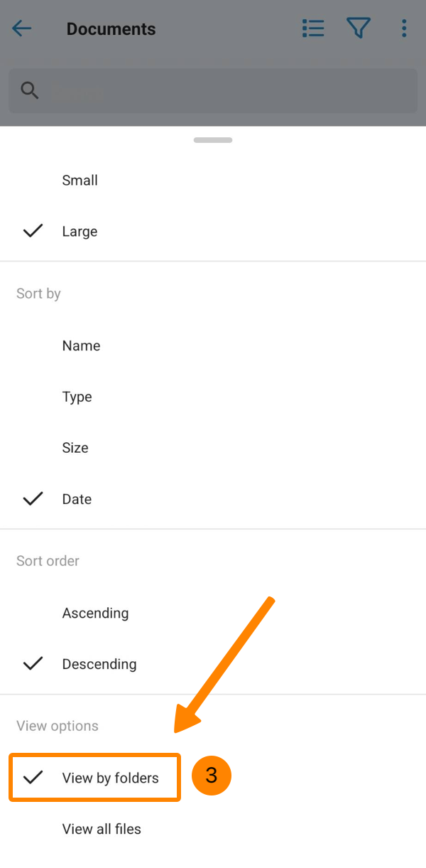 U mobilnoj aplikaciji pretraživanje u dokumentima trenutno podržava samo pretraživanje u trenutnoj mapi bez podmapa.