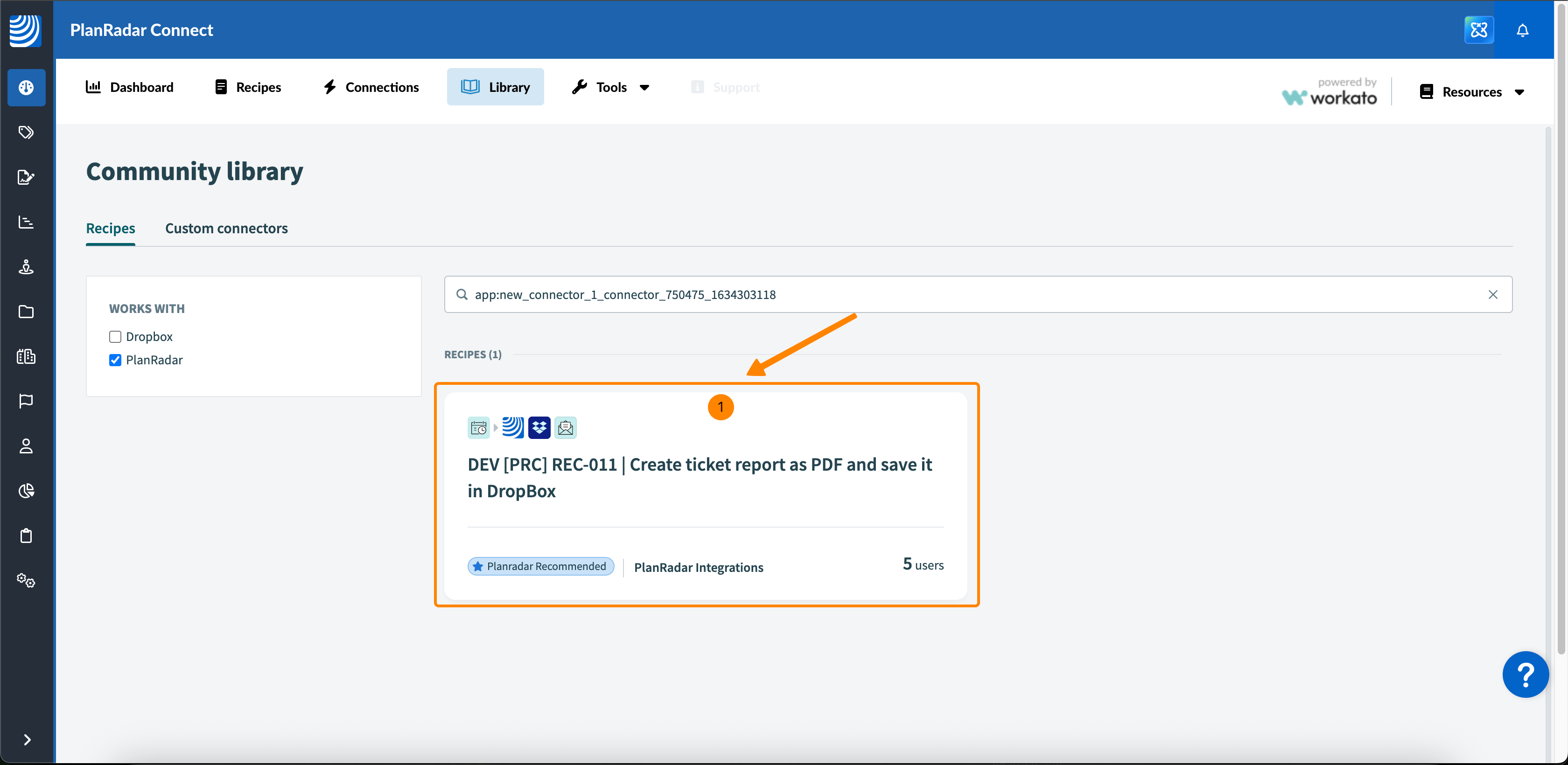 Da biste pronašli PlanRadar primjere recepata u Workato zajedničkoj knjižnici: