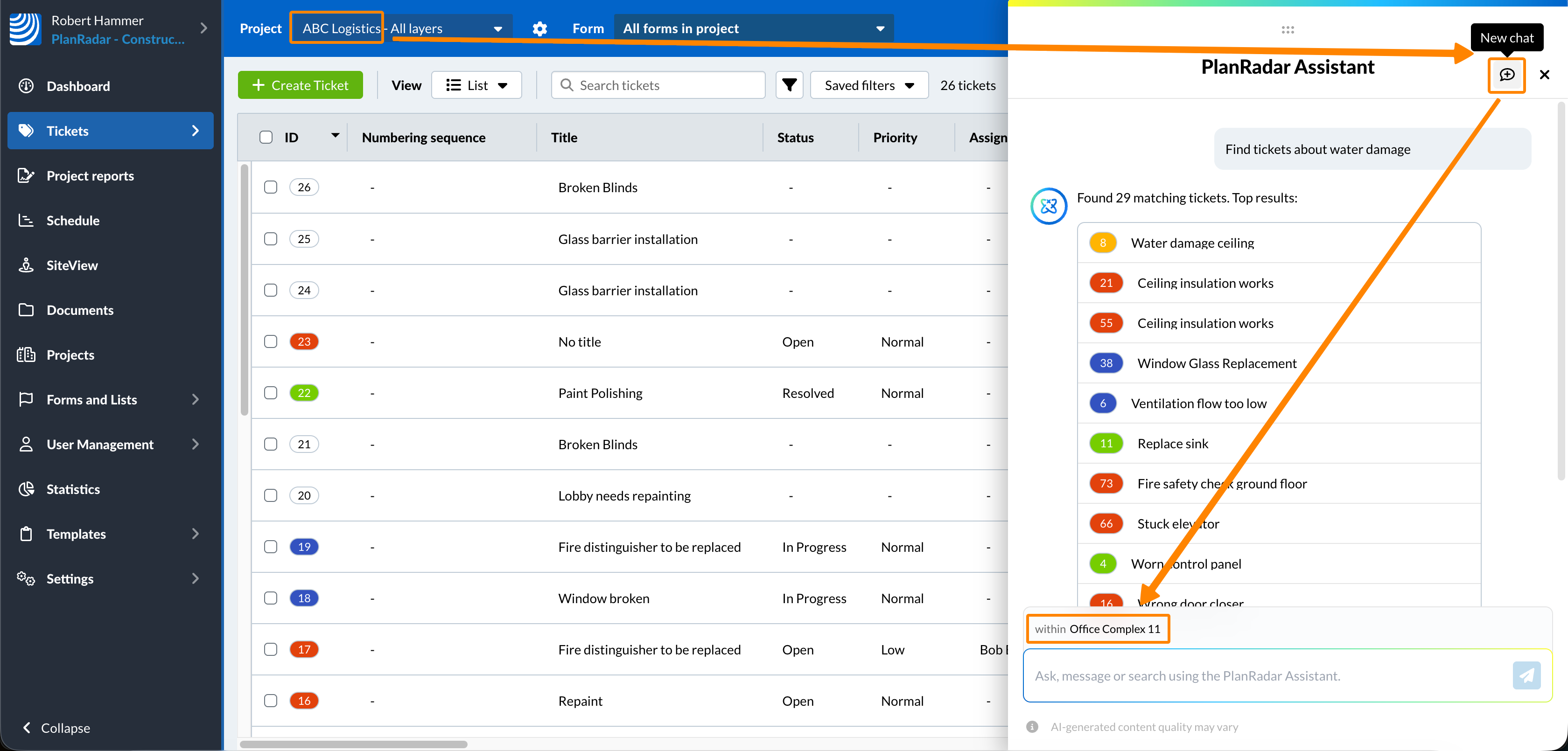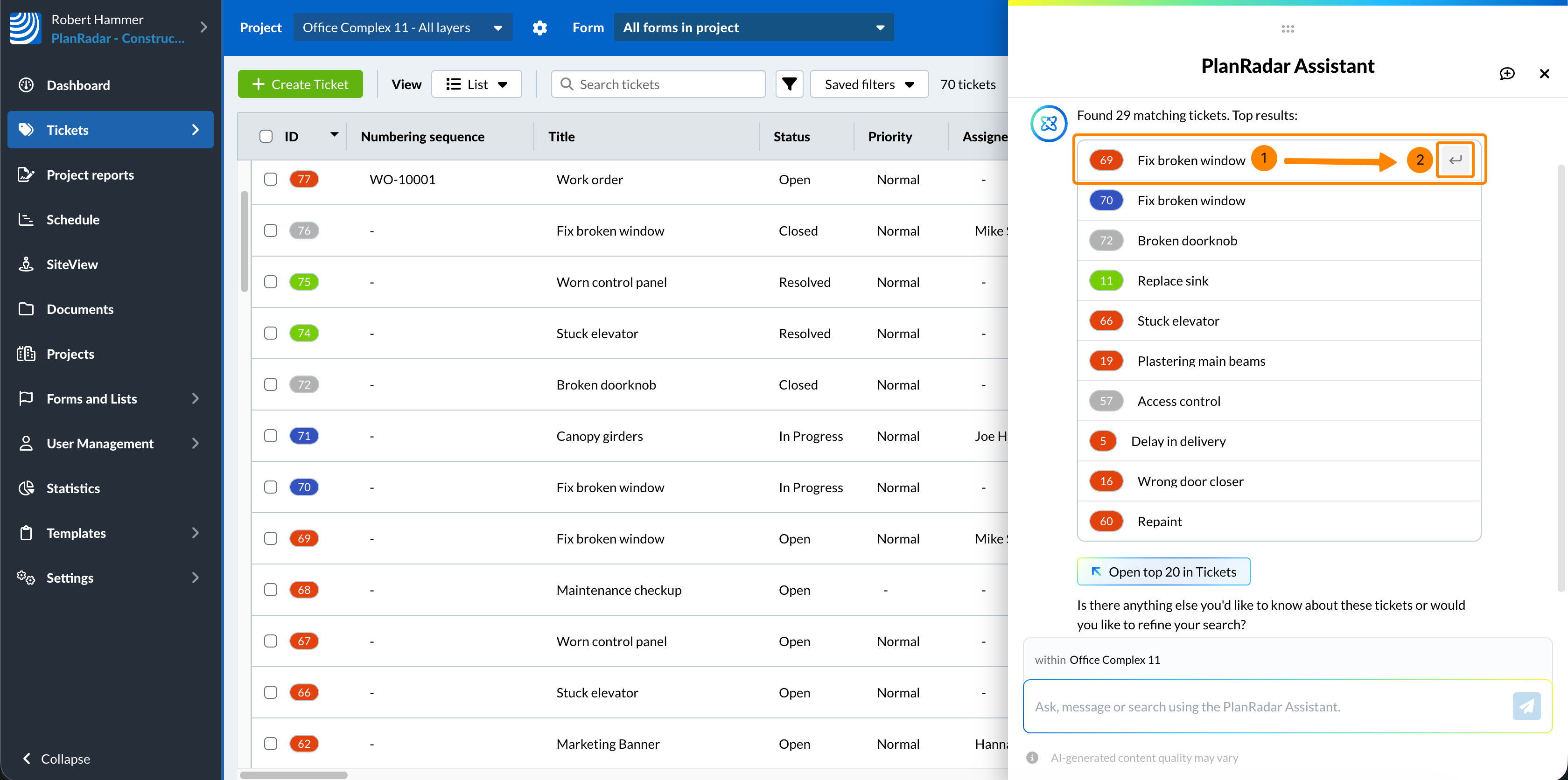 - Unesite svoj zahtjev u polje za unos u chatu, npr. 'Pronađi ticketi za razbijene prozore'