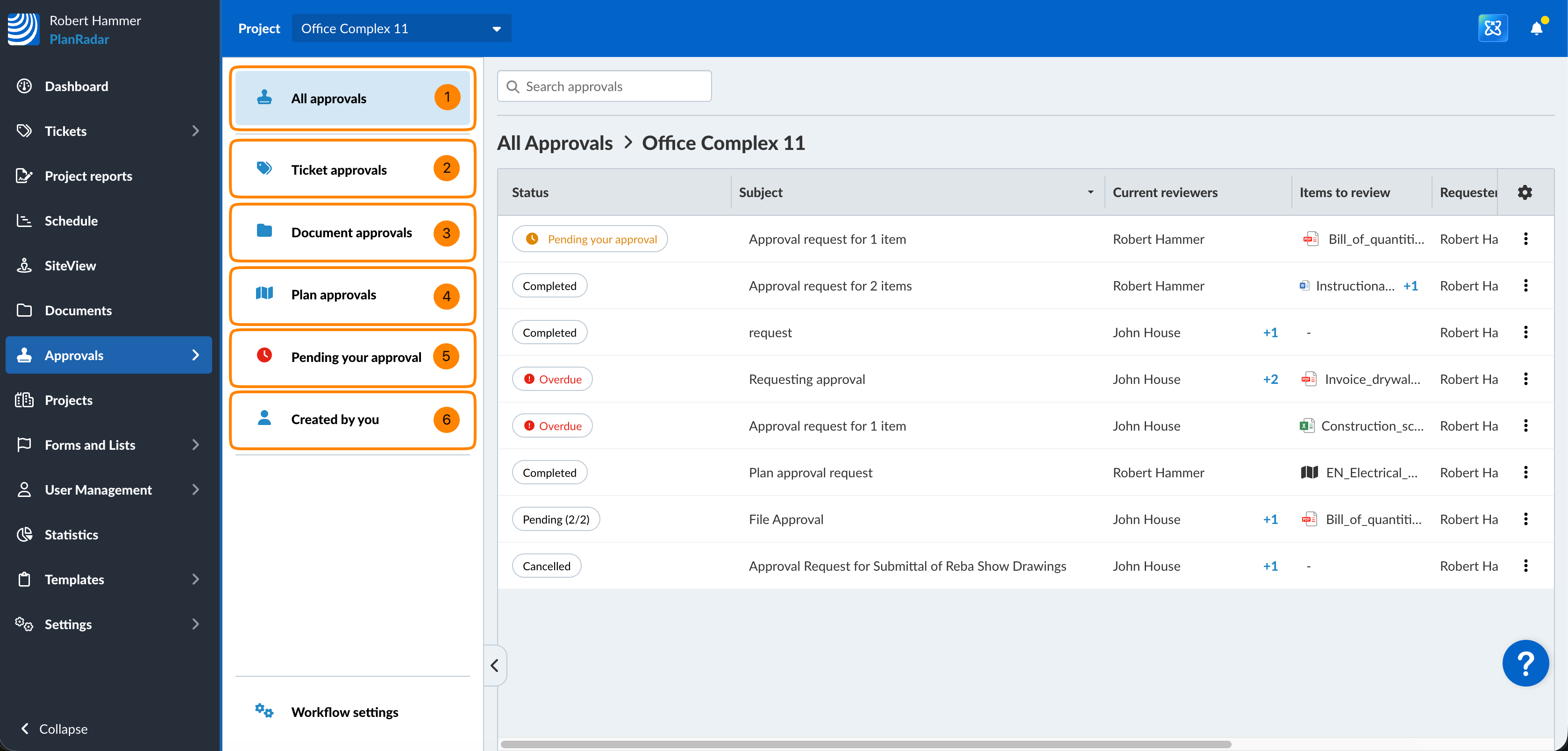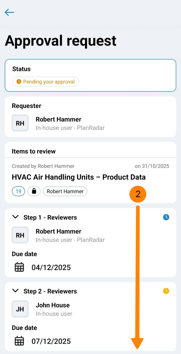 U mobilnoj aplikaciji ne postoji pregled za pronalaženje svih zahtjeva za odobrenje na jednom mjestu. Za daljnje radnje morate otići na detalje zahtjeva za odobrenje kako je opisano u nastavku za ticketi Odobrenja i Odobrenja dokumenata i planova.