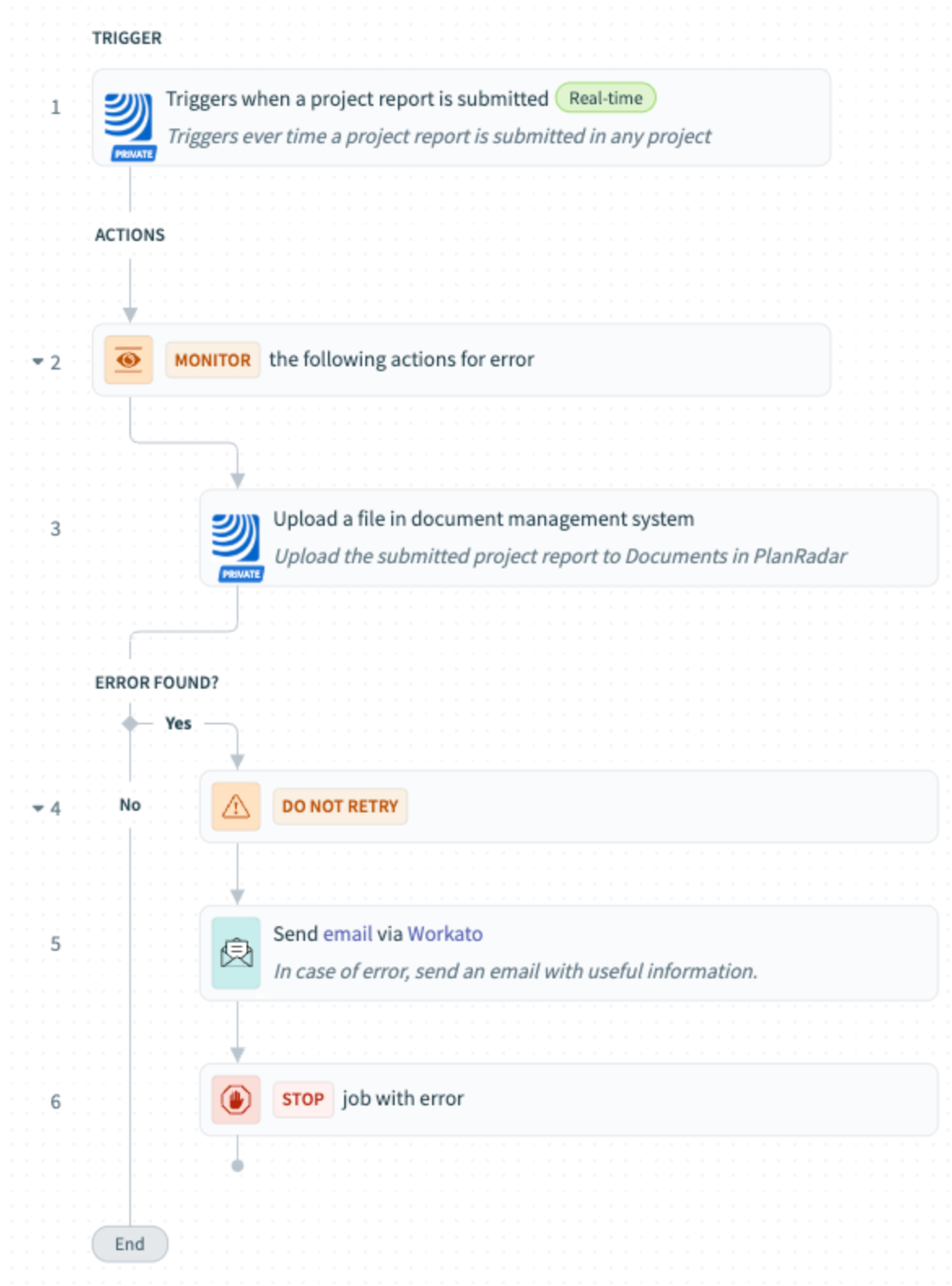 Recept automatski pohranjuje izvješća u PlanRadar Dokumente.