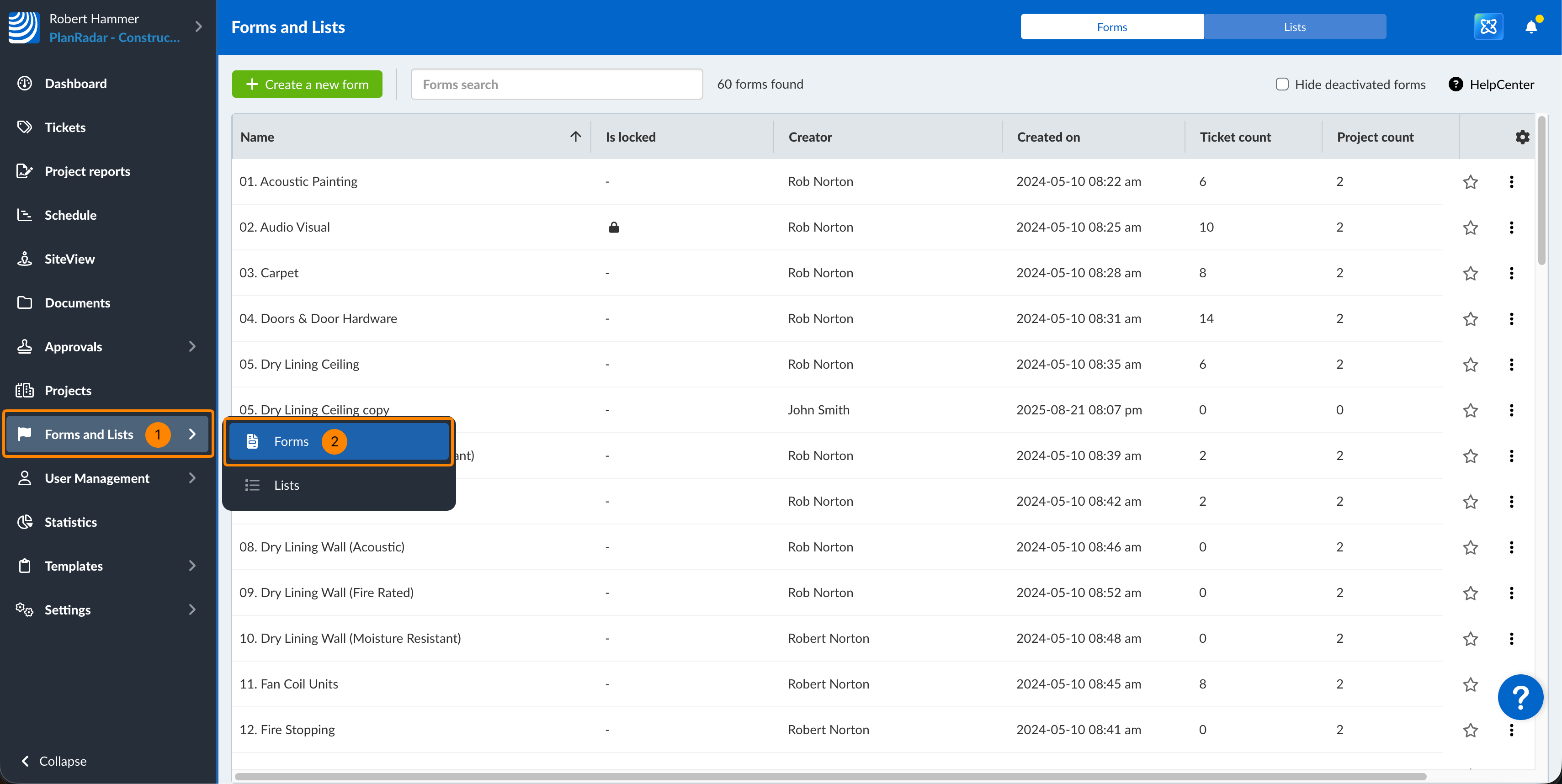 - Kliknite Obrasci i popisi