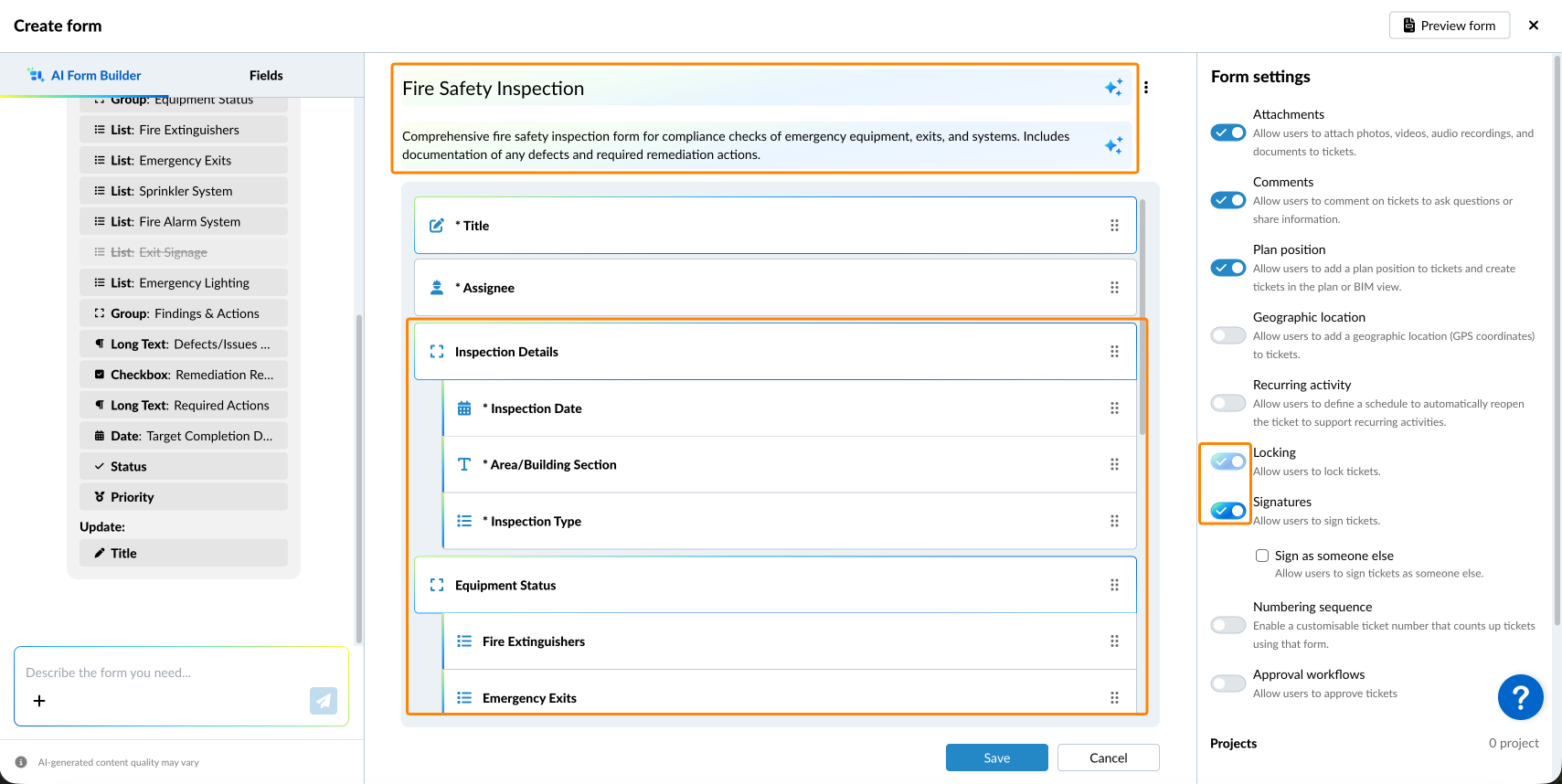 AI Form Builder stvara i konfigurira obrasce iz opisa na prirodnom jeziku ili prenesenog dokumenta - bez obzira započinjete li novi obrazac ili uređujete postojeći.