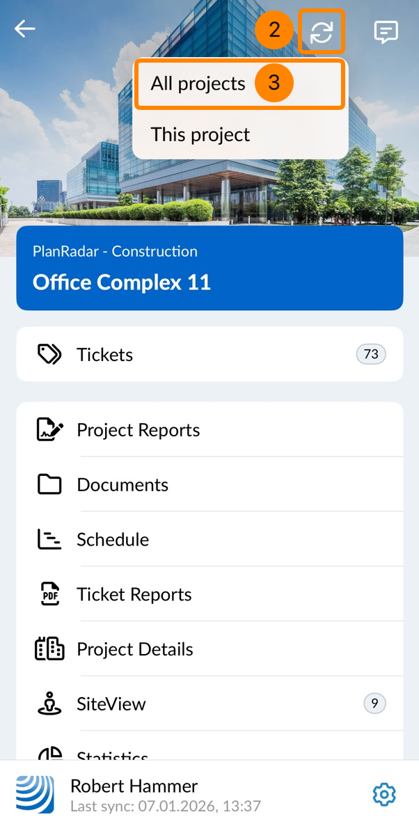 Deve anche assicurarsi di sincronizzare regolarmente i suoi dati per essere sicuro di avere i dati più recenti sul suo dispositivo. Questo è particolarmente importante se prevede di avere una connessione internet scarsa o assente nel luogo in cui desidera utilizzare l'applicazione PlanRadar. Quando sincronizza la sua app, tutti i dati del progetto, compresi gli allegati di Ticket, Ticket e i piani, vengono scaricati nella sua app mobile.