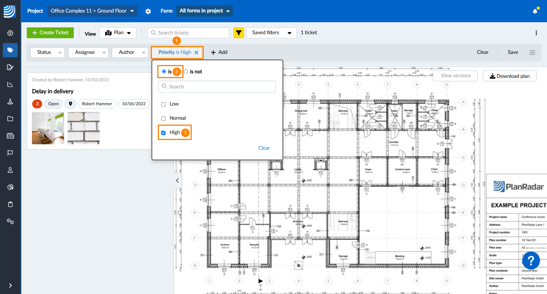 Per filtrare i biglietti che hanno il valore Alto nel campo del biglietto Priorità: