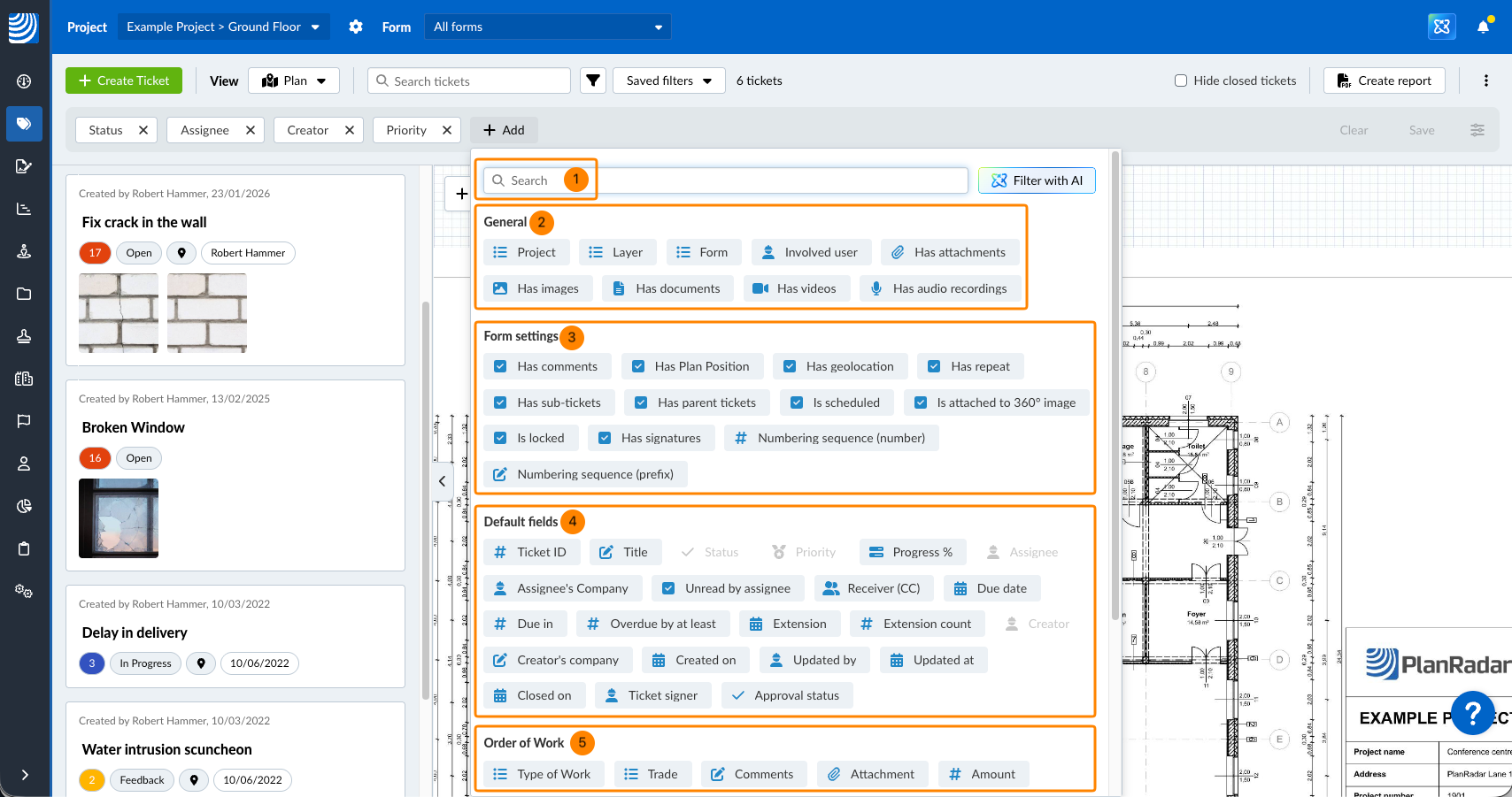 - Campi predefiniti include tutti i campi predefiniti che PlanRadar offre per i moduli e alcuni criteri basati su di essi, come Azienda del destinatario, Scadenza in, o Scadenza minima.
