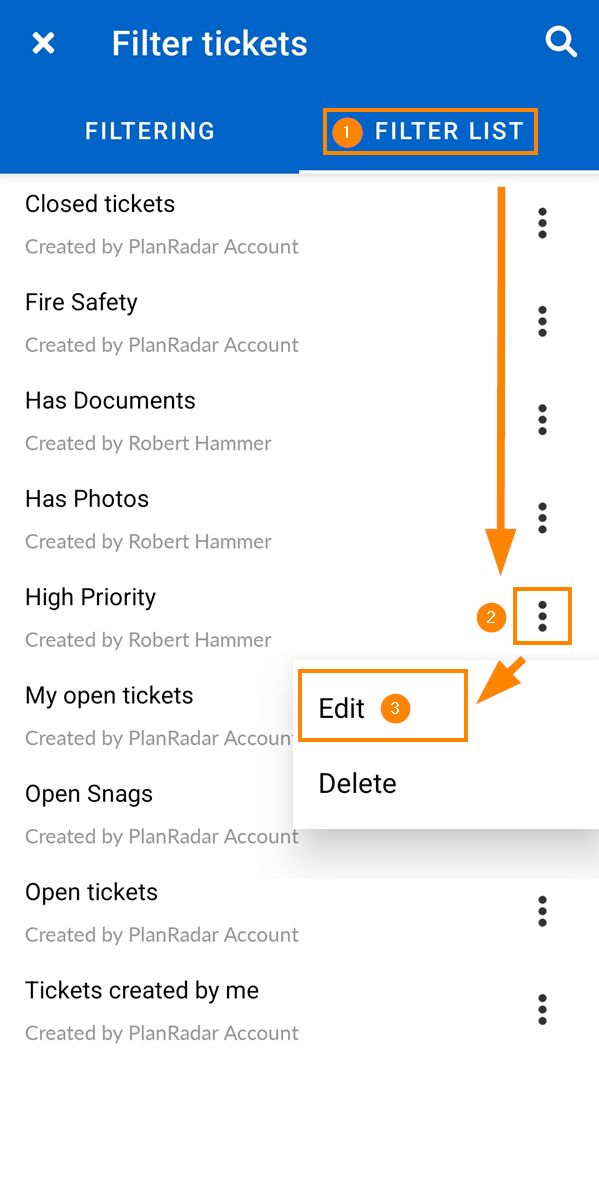 Si noti che i filtri vengono applicati insieme a qualsiasi termine di ricerca e in base ai ticket del progetto selezionato, del livello e, nel caso della Webapp, anche del modulo.
