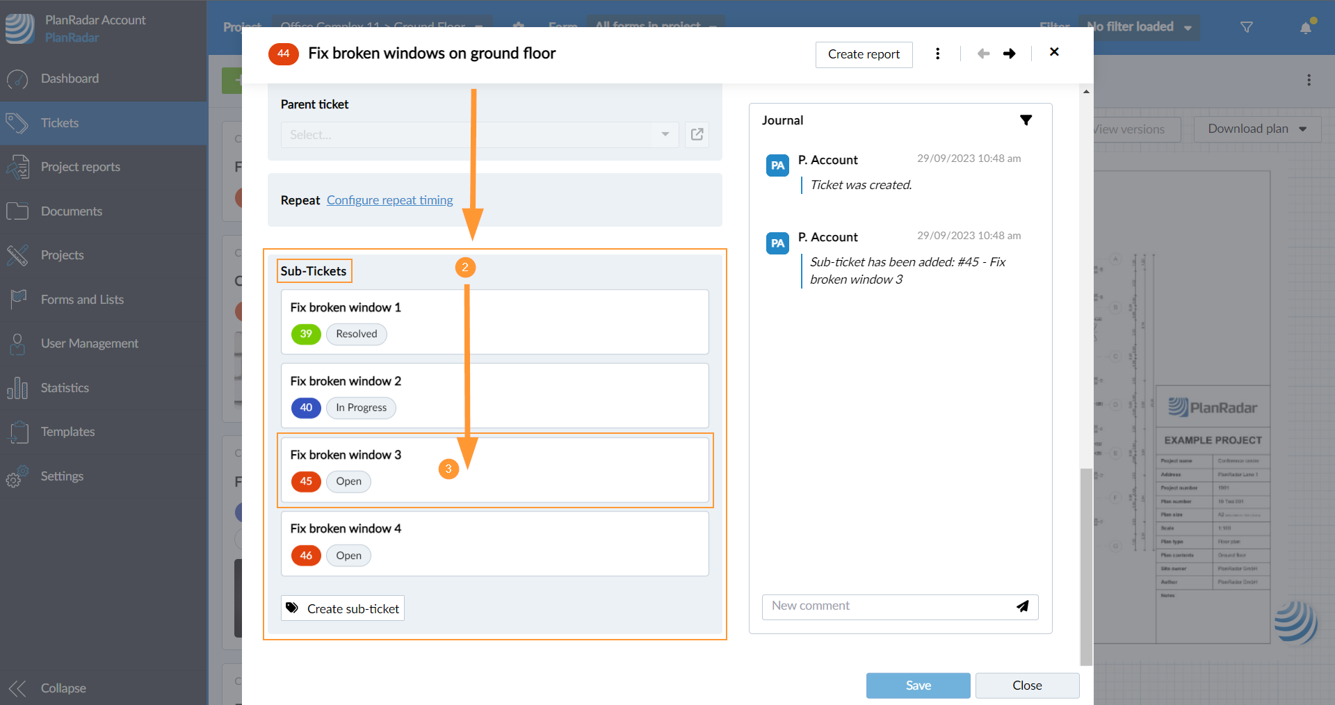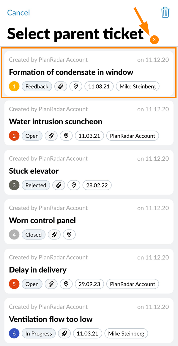 Qualsiasi ticket può diventare un sotto-ticket di un altro ticket, rendendo l'altro ticket il ticket padre. Un sotto-ticket può utilizzare una forma diversa dal suo genitore e può trovarsi su un livello diverso all'interno dello stesso progetto. Un ticket genitore non può essere contemporaneamente un sub-ticket.