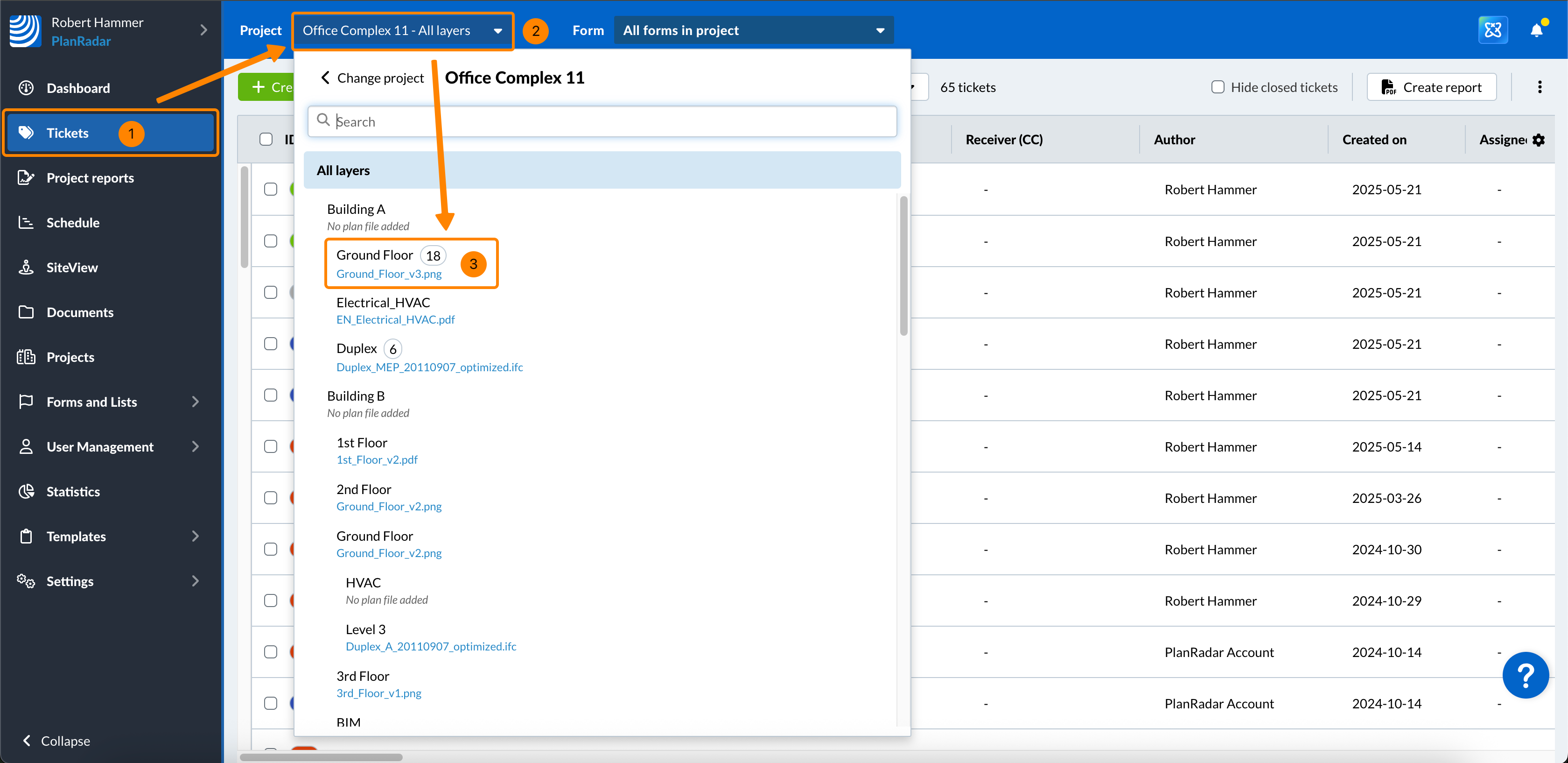 Nella barra degli strumenti seleziona il progetto, il livello, il modulo e il filtro per definire quali biglietti vengono visualizzati nella vista del piano biglietti.