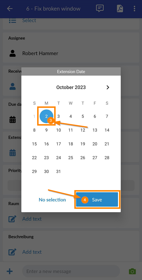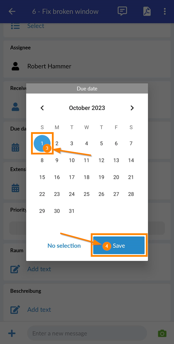L'assegnazione di date di scadenza ai compiti è un fattore principale per una gestione efficiente del tempo e per la definizione delle priorità dei compiti, offrendo una chiara tempistica per il completamento dei compiti. Con PlanRadar, può impostare date di scadenza per le risoluzioni dei ticket e, in caso di necessità, può facilmente estendere queste date aggiungendo una data di proroga ai ticket.