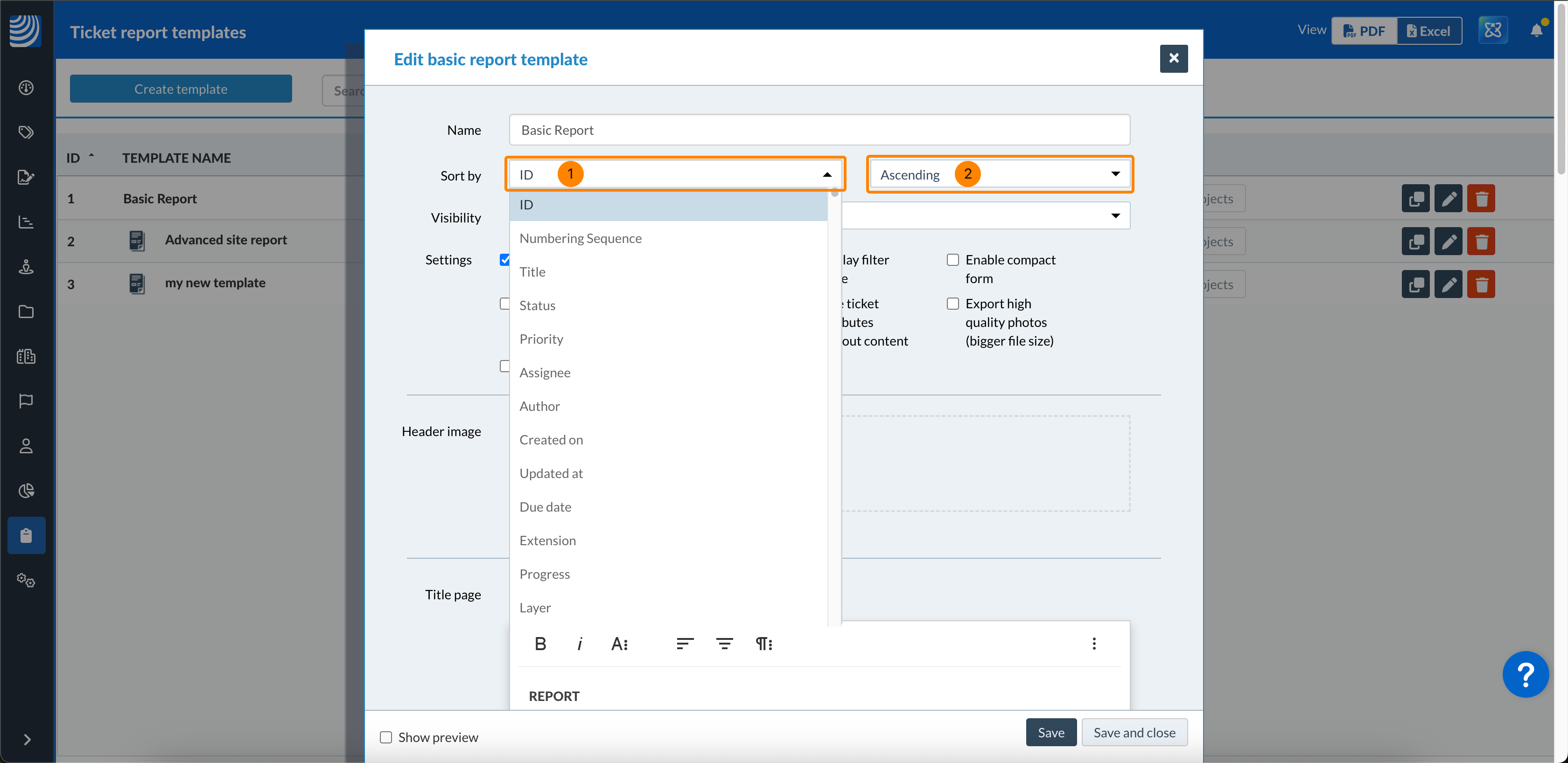 - Esportazione di foto di alta qualità (dimensione del file maggiore): Le foto allegate ai biglietti avranno una qualità superiore, a costo di una maggiore dimensione del file del rapporto PDF del biglietto.