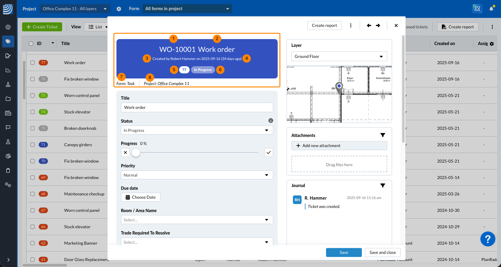 - Stato (anche il colore dello sfondo corrisponde allo stato) - per saperne di più, consulti Colori di stato e Ticket Pin.