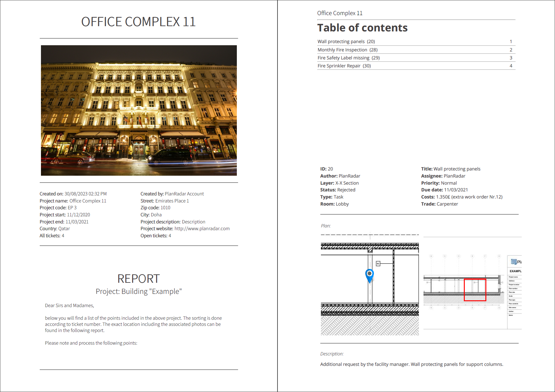 I rapporti sui ticket possono essere creati in qualsiasi momento per una selezione di ticket, anche utilizzando dei filtri. Di solito, vengono creati come PDF che possono essere condivisi al di fuori di PlanRadar. È anche possibile esportarli come file Excel per lavorare con i dati in altri strumenti.