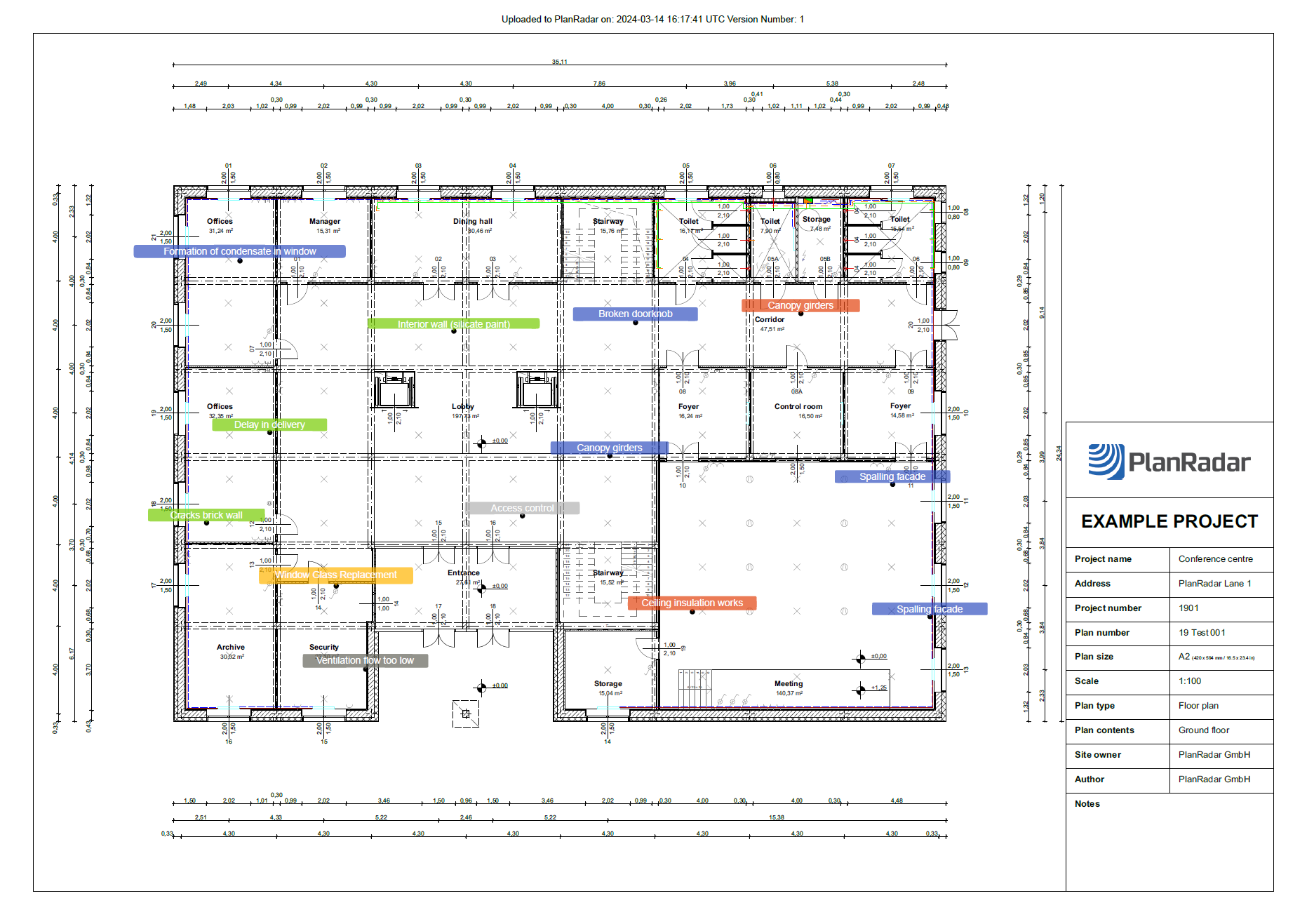 Può scaricare qualsiasi piano in formato PDF per conservarlo sul suo dispositivo o condividerlo al di fuori di PlanRadar. Può opzionalmente includere i pin dei ticket e definirne la dimensione e la didascalia (ID o titolo del ticket), nonché i metadati del piano (versione del piano e quando è stato caricato).