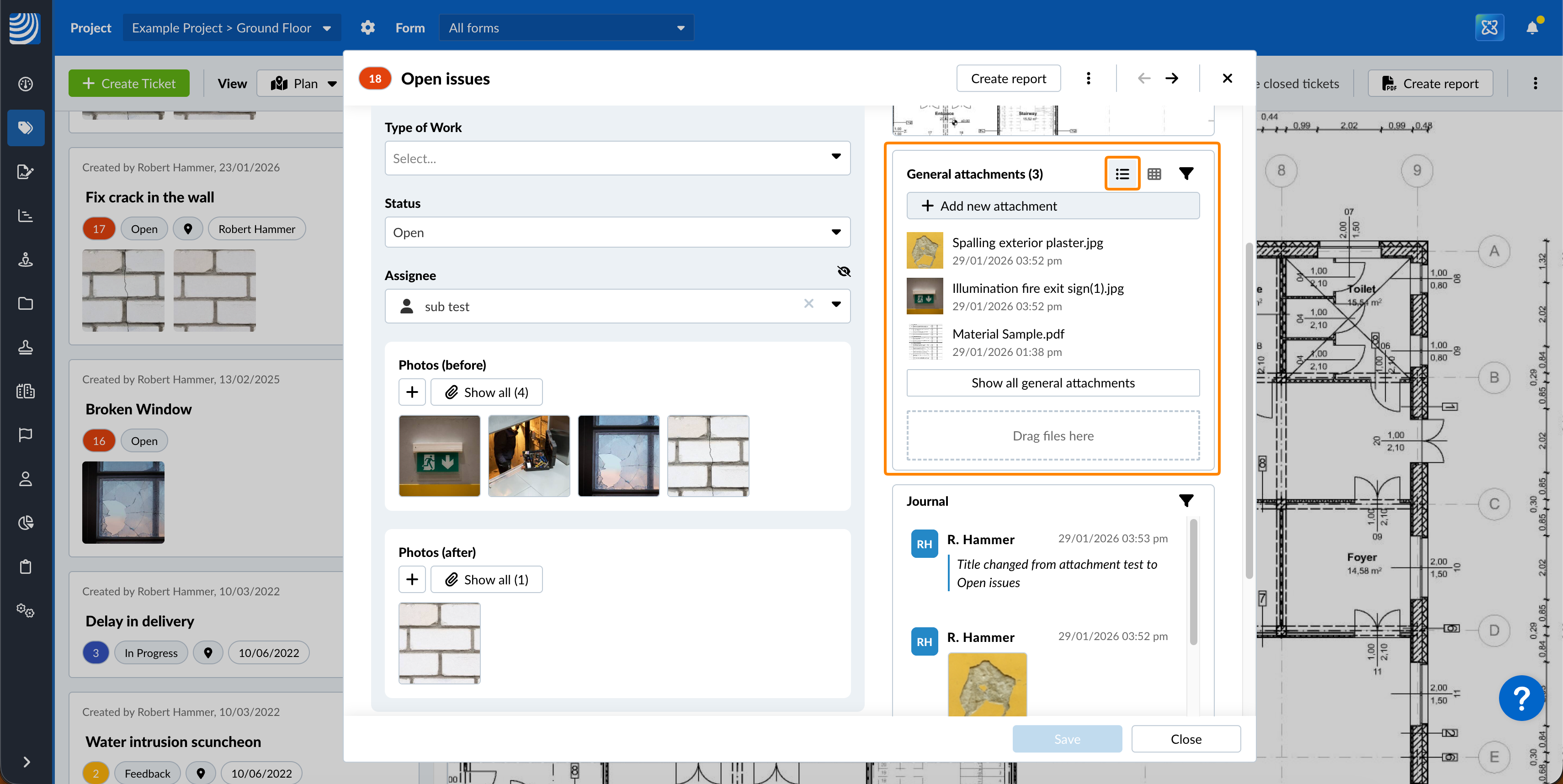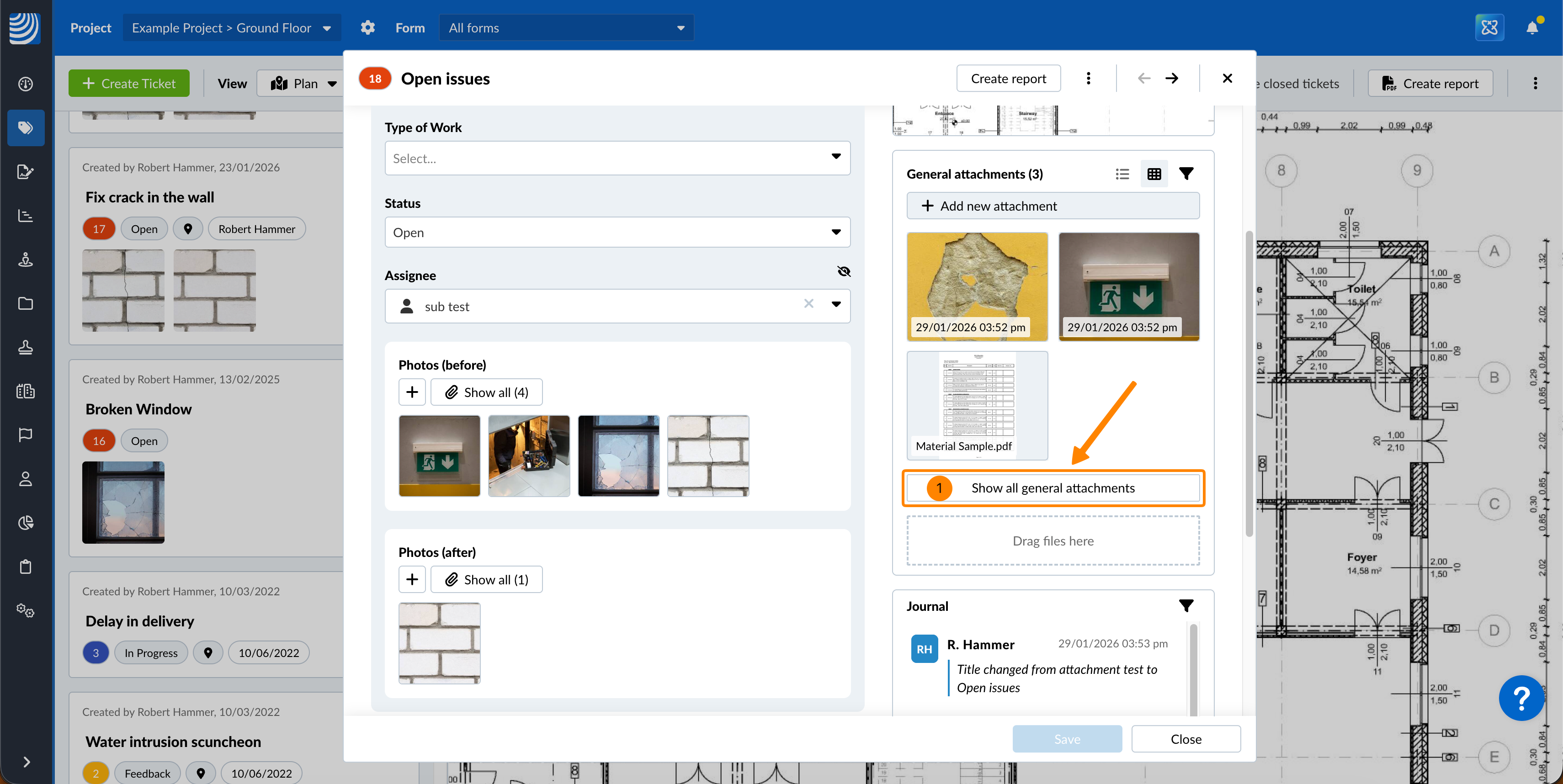 All'indirizzo Visualizza e modifica un biglietto, può visualizzare rapidamente gli allegati cliccando sulle miniature per aprire il visualizzatore di allegati per i media (foto e video) o per i PDF. Può visualizzare tutti gli allegati del campo o gli allegati generali in gallerie separate.