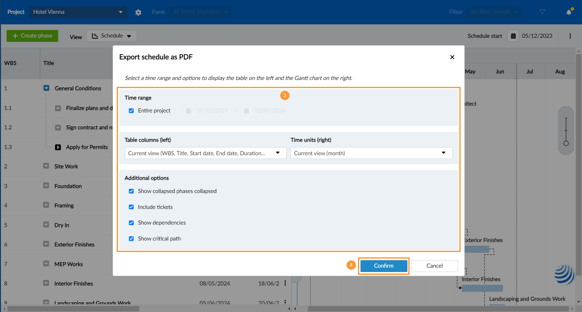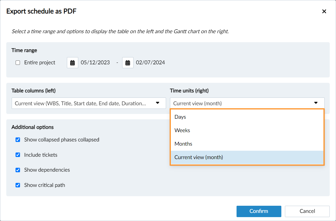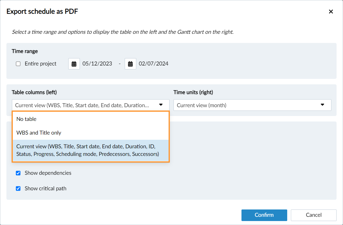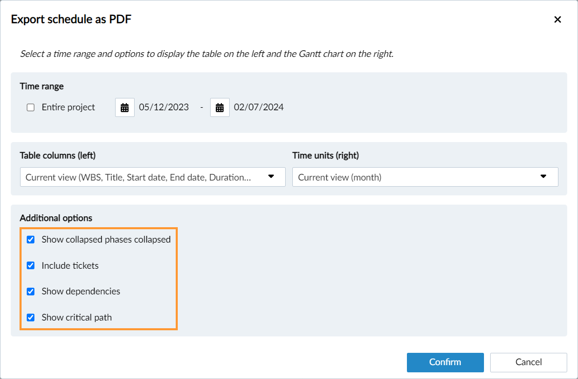 Per impostazione predefinita, viene esportata l'intera pianificazione con le configurazioni di visualizzazione correnti per WBS e diagramma di Gantt. Modifichi queste impostazioni secondo le necessità.
