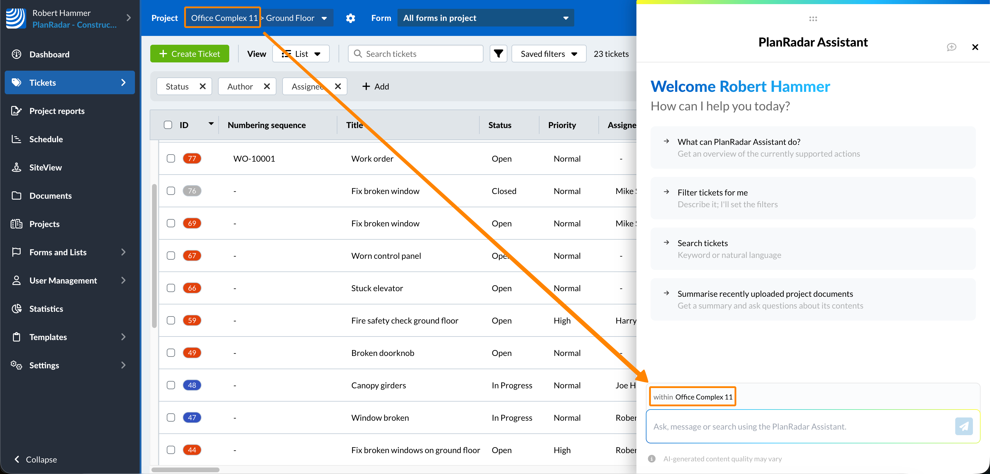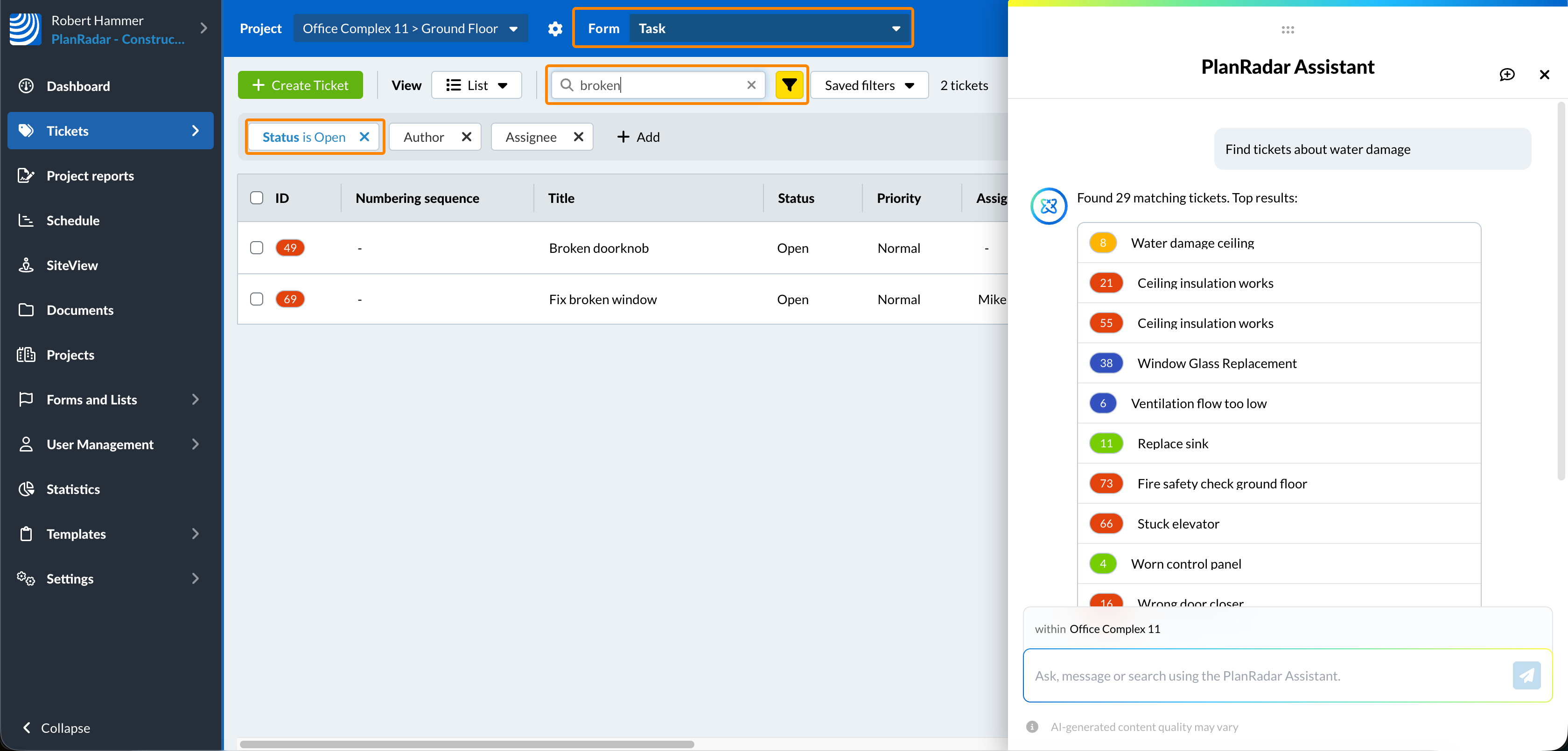 I risultati della ricerca AI non sono influenzati da filtri attivi, moduli selezionati o termini di ricerca manuali. Cercherà in tutti i siti Ticket del progetto corrente che lei ha il permesso di visualizzare.