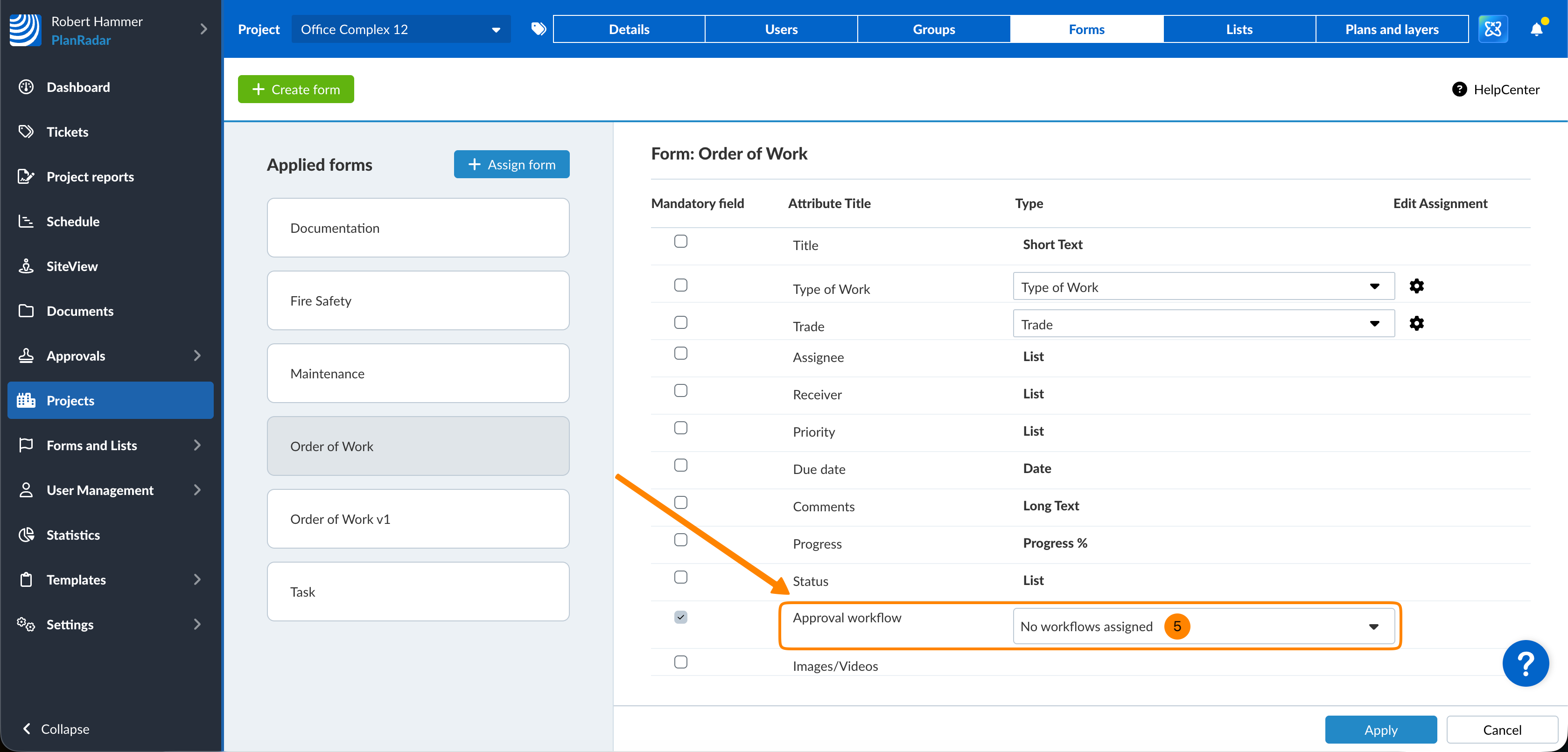 Aggiunga i flussi di lavoro di approvazione ai moduli o alla sezione Documenti dei progetti per renderli disponibili quando richiede l'approvazione. I flussi di lavoro devono essere prima creati come descritto in Creare e gestire i flussi di lavoro di approvazione.