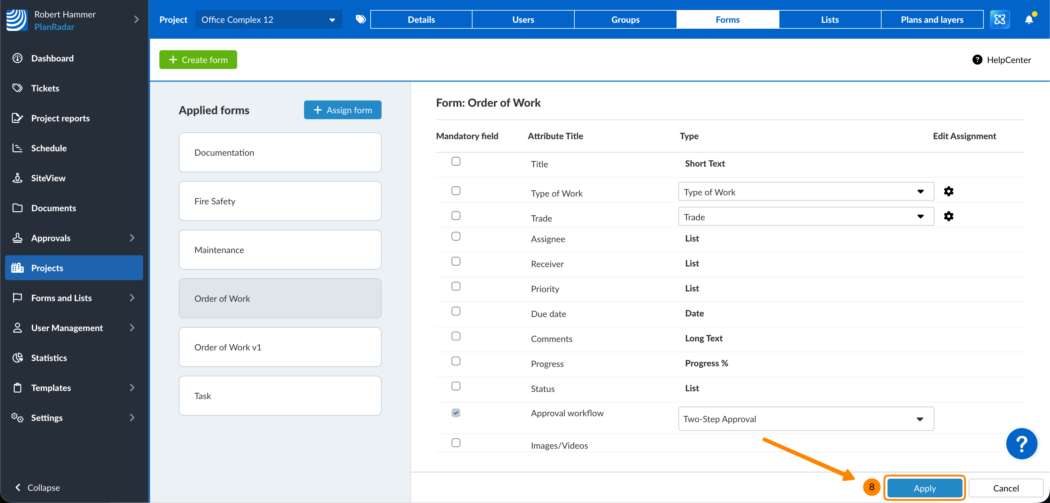 - Clicchi su Applica per salvare il/i flusso/i di lavoro selezionato/i nel modulo di questo progetto