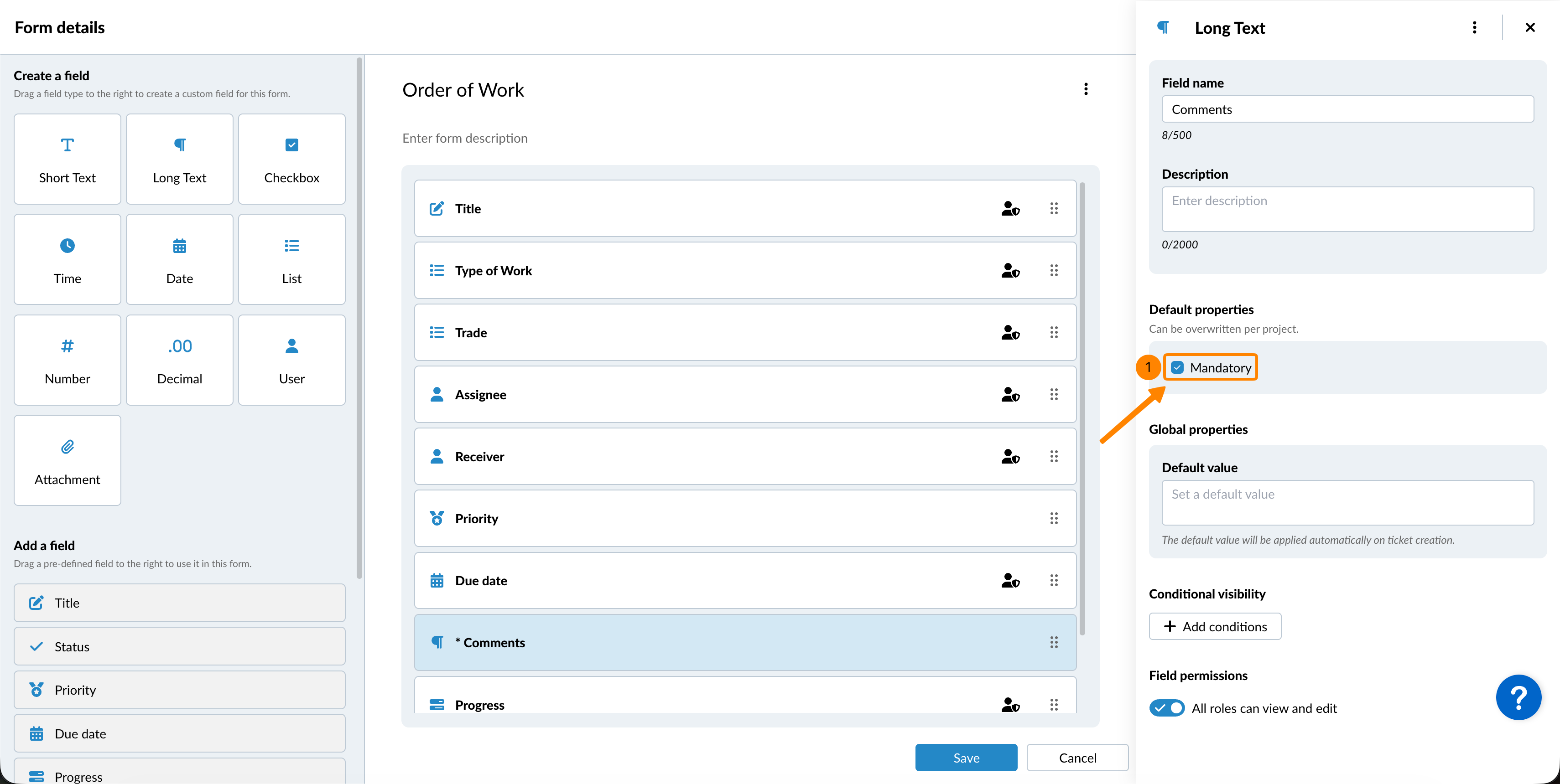 Questa impostazione predefinita viene applicata quando aggiunge il modulo ad un progetto. Può comunque modificare l'impostazione obbligatoria per ogni singolo progetto. Per saperne di più: Gestire i moduli di un progetto > Modificare le impostazioni dei campi obbligatori .