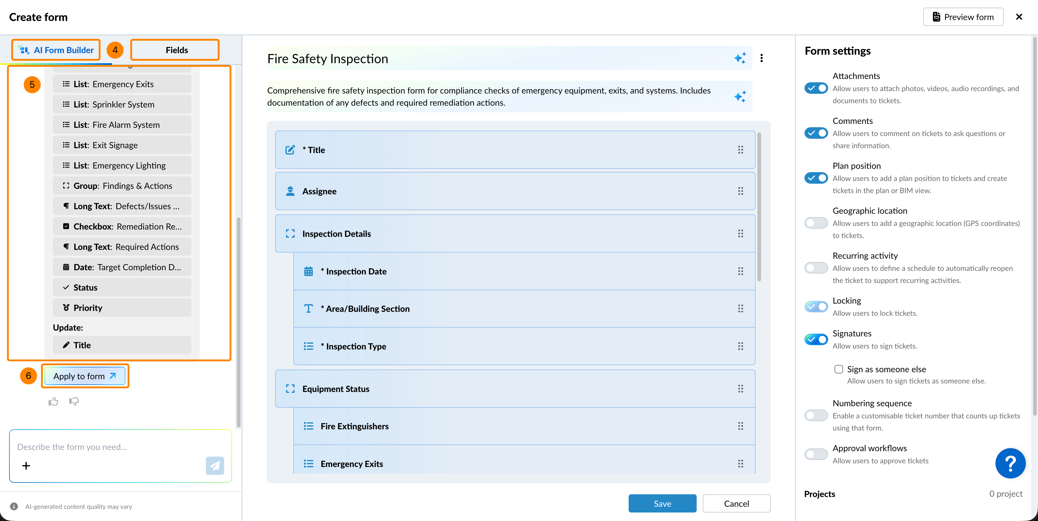 | Forma | Nome, descrizione e impostazioni: allegati, commenti, posizione del piano, geolocalizzazione, attività ricorrente, blocco, sequenza di numerazione, firme e flussi di lavoro di approvazione. |