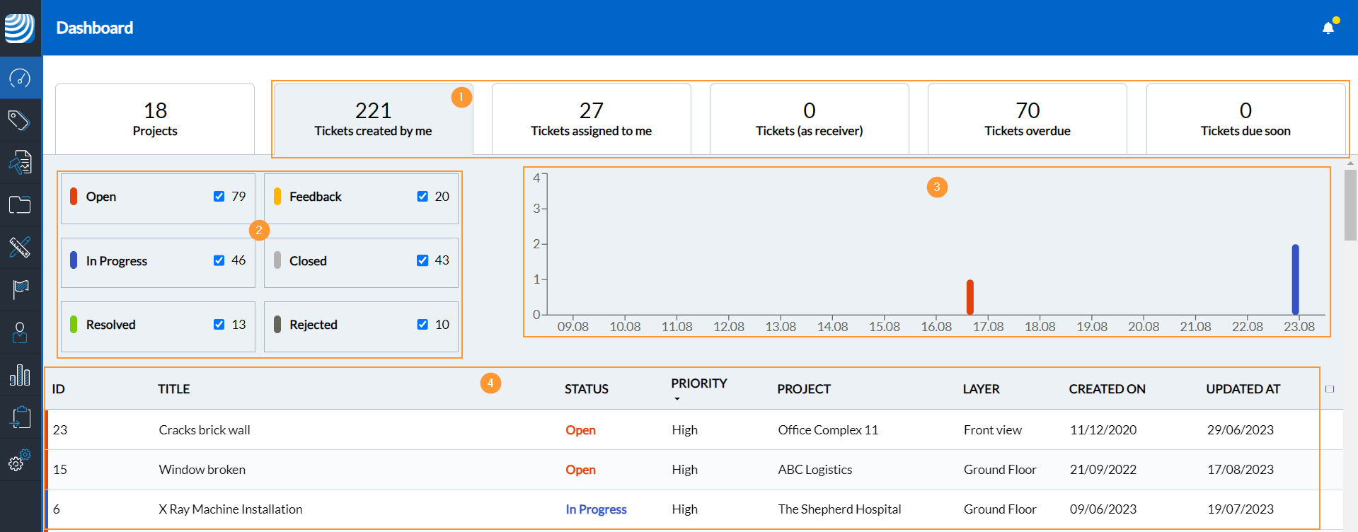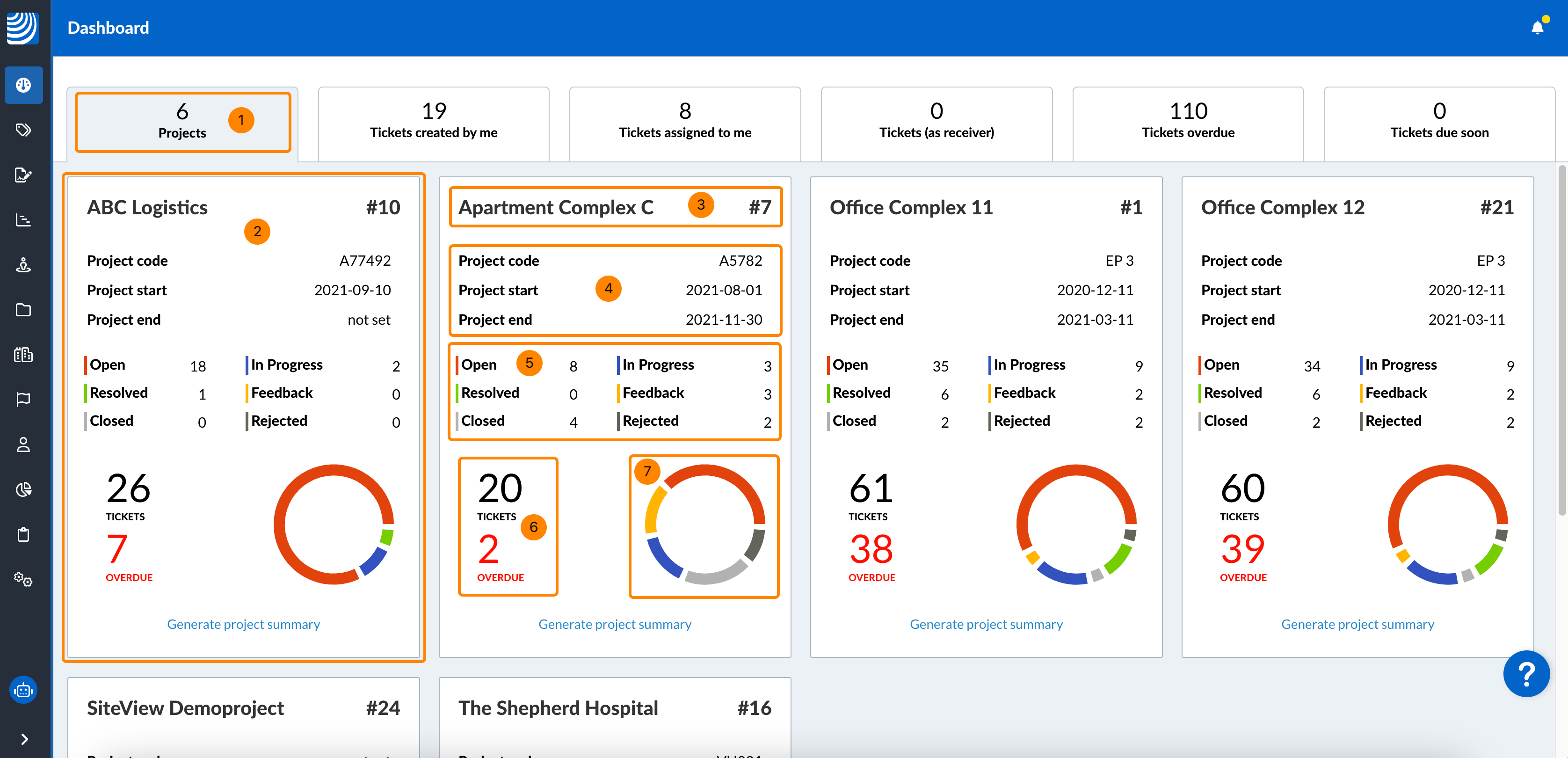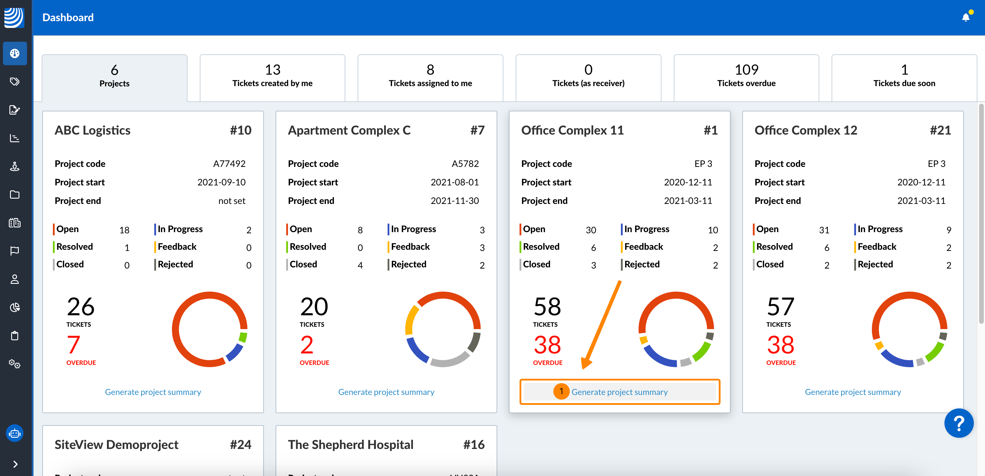Przegląd wszystkich projektów i zgłoszeń można uzyskać za pomocą pulpitu nawigacyjnego w aplikacji internetowej.