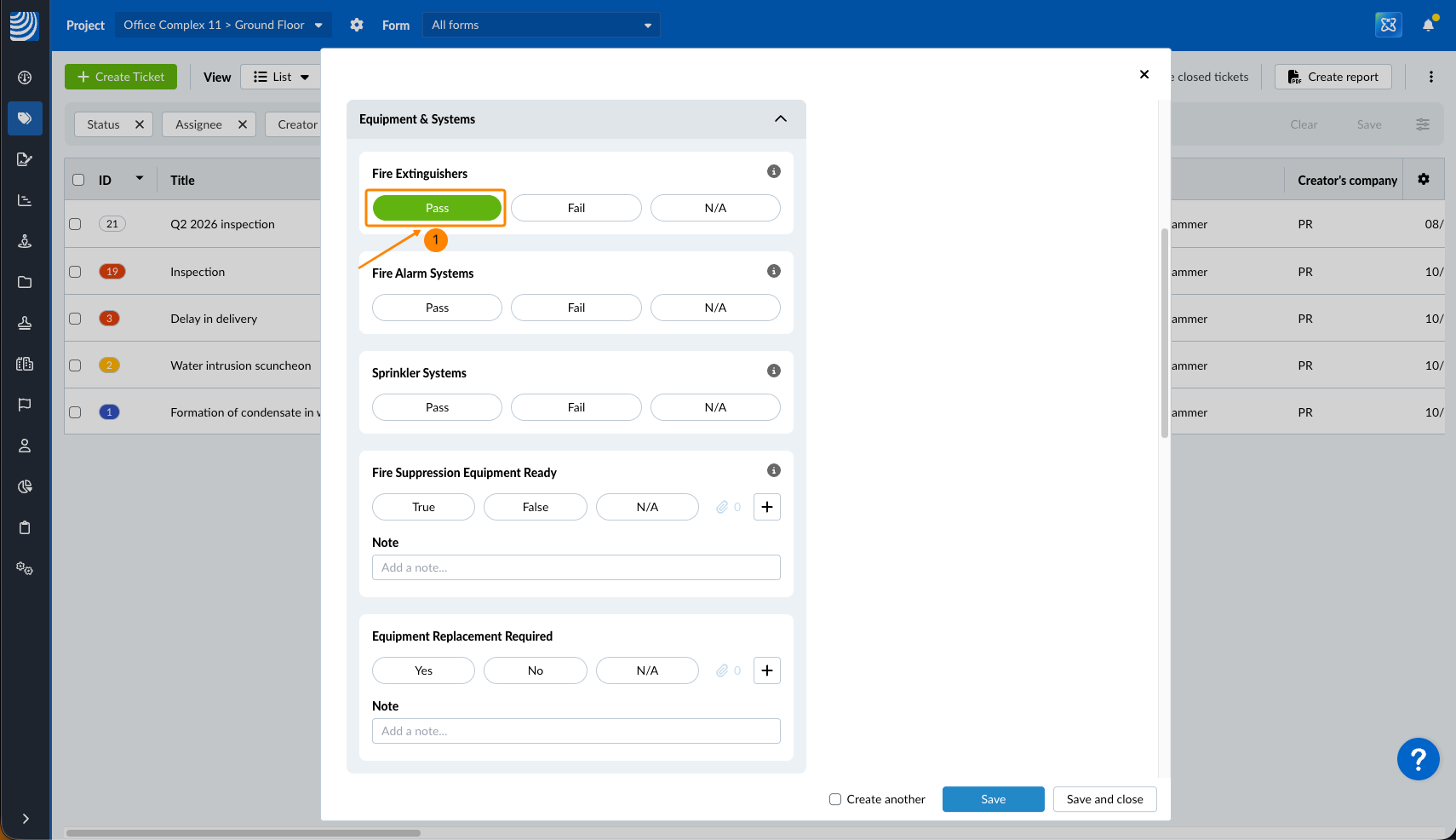 Formularz może mieć niestandardowe pola listy kontrolnej. Umożliwiają one wybór jednej z trzech opcji odpowiedzi oraz opcjonalnych/obowiązkowych notatek lub załączników. Opcje odpowiedzi i kolory można skonfigurować dla każdego pola listy kontrolnej z predefiniowanych zestawów opcji, np. tak (zielony), nie (czerwony) i nie dotyczy (niebieski).