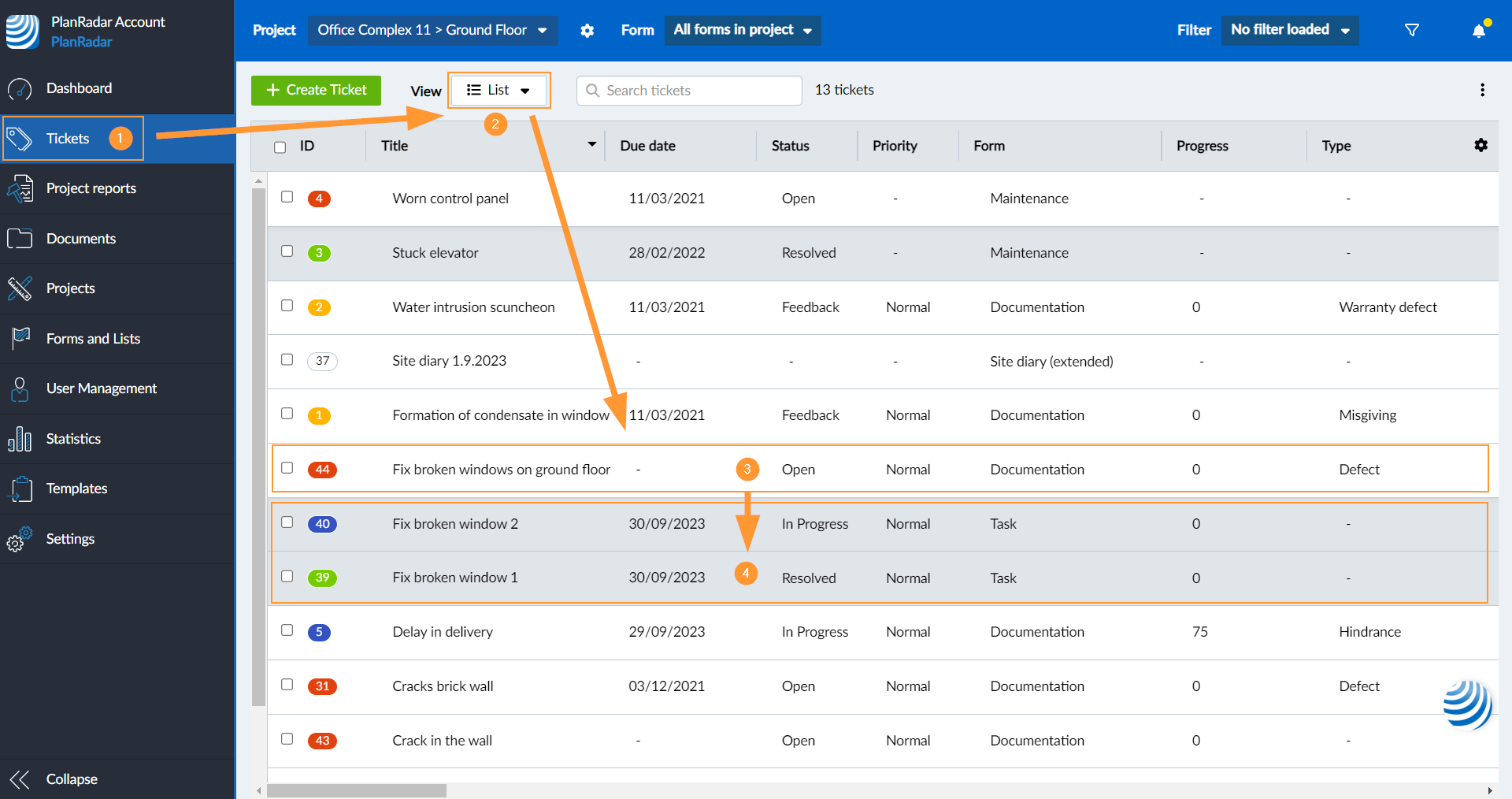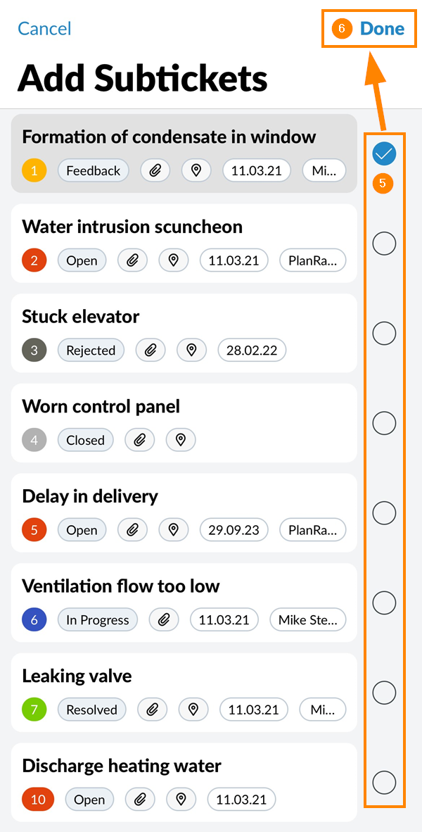 Jeśli bilety podrzędne nie pasują do wyszukiwanego hasła, kryteriów filtrowania, wybranego formularza lub warstwy, nie będą wyświetlane w widoku listy.