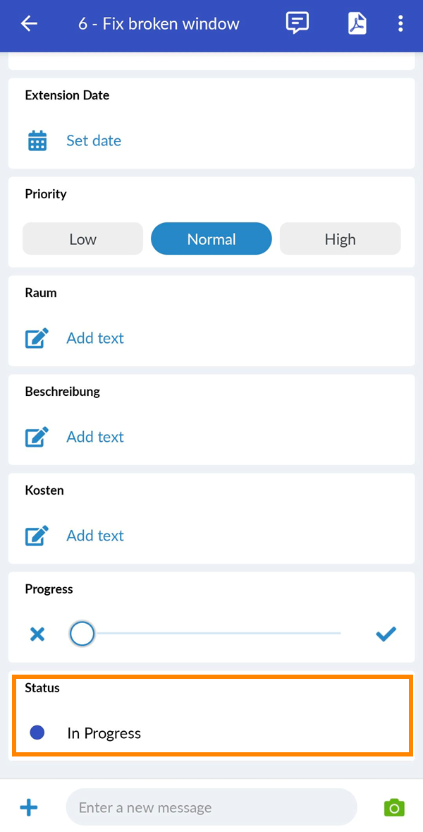 Status i postęp zgłoszeń mogą być wykorzystywane w harmonogramach do automatycznego obliczania postępu faz nadrzędnych. Więcej informacji znajdą Państwo na stronie Schedules > Progress.