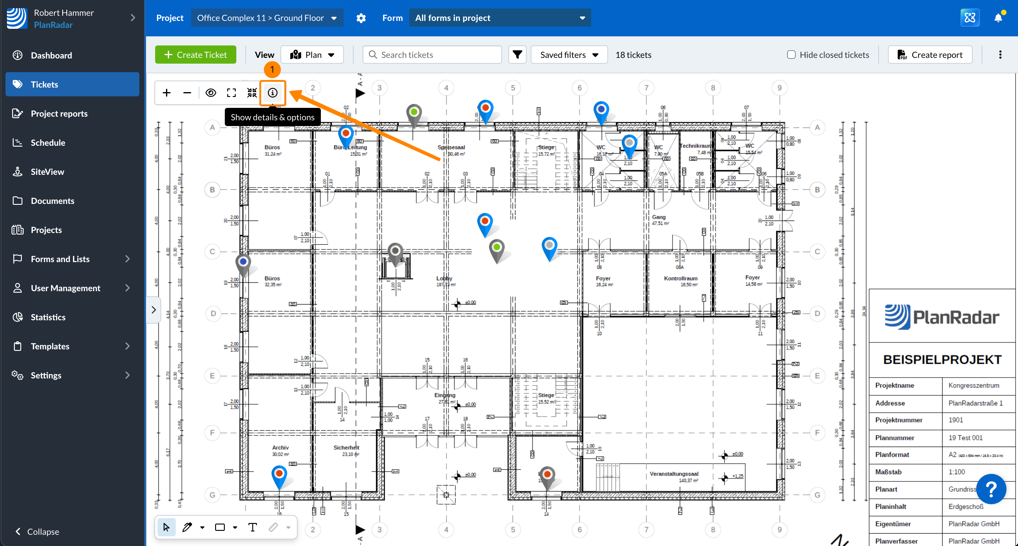 Można pobrać dowolny plan w formacie PDF, aby przechowywać go na swoim urządzeniu lub udostępniać poza PlanRadar. Opcjonalnie można dołączyć pinezki zgłoszeń i zdefiniować ich rozmiar oraz podpis (identyfikator lub tytuł zgłoszenia), a także metadane planu (wersja planu i data jego przesłania).