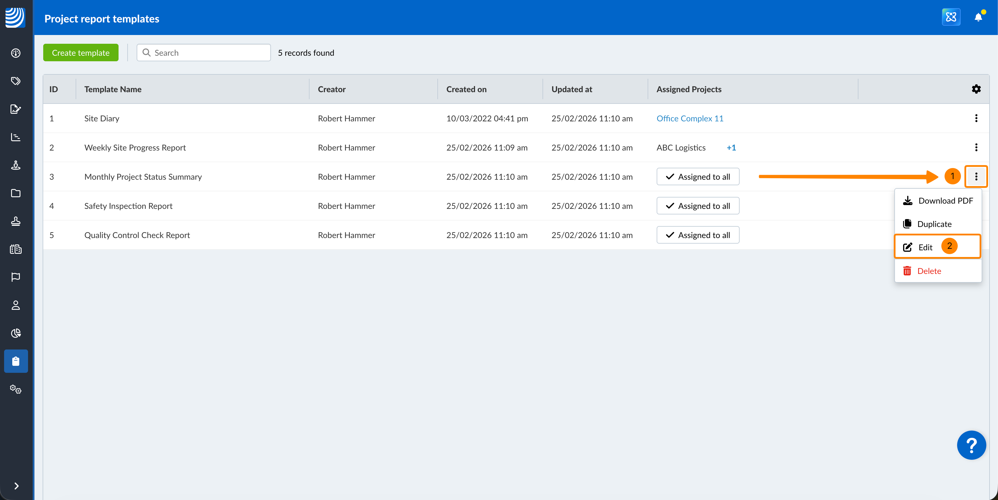 Mogą Państwo zarządzać szablonami raportów projektów, które zostały utworzone przez Państwa i inne osoby - patrz także Tworzenie i edycja szablonów raportów projektów. W szczególności mogą Państwo przeglądać/edytować, pobierać, powielać i usuwać raporty projektów.