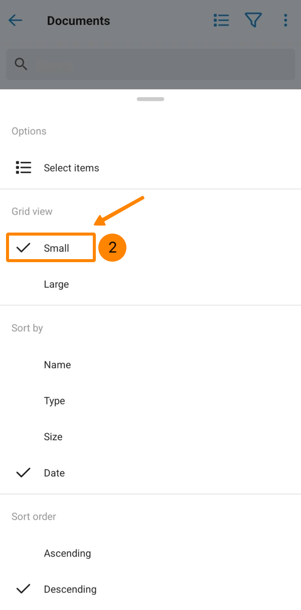 - Proszę dotknąć Nazwa, Typ, Rozmiar lub Data