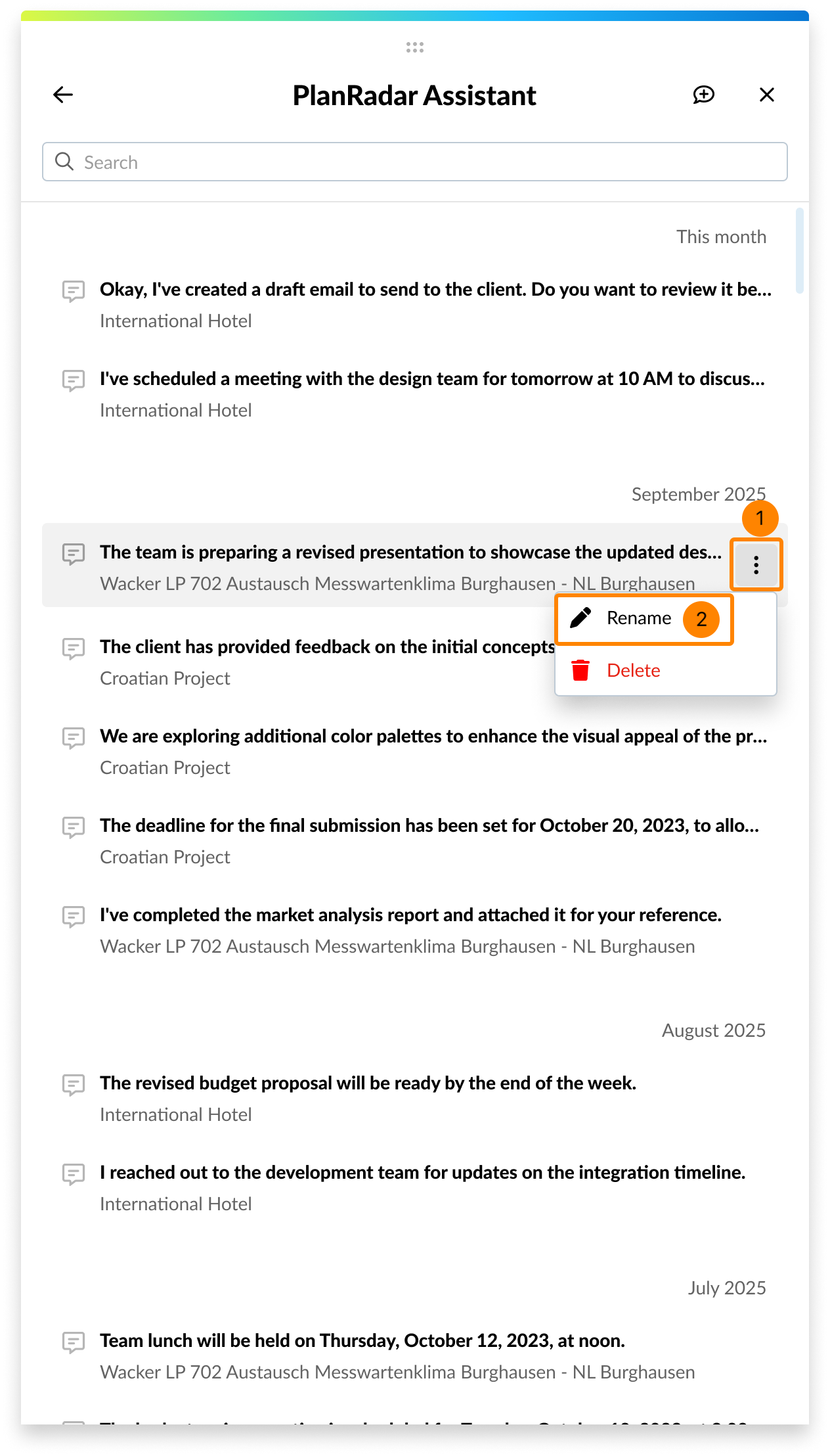Mogą Państwo przeglądać historię swoich rozmów z Asystentem AI, a także wyszukiwać je, otwierać, zmieniać ich nazwy lub usuwać. Historia wyświetla 100 ostatnich czatów - starsze są automatycznie usuwane z listy.